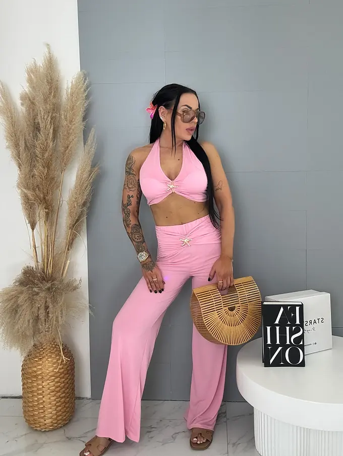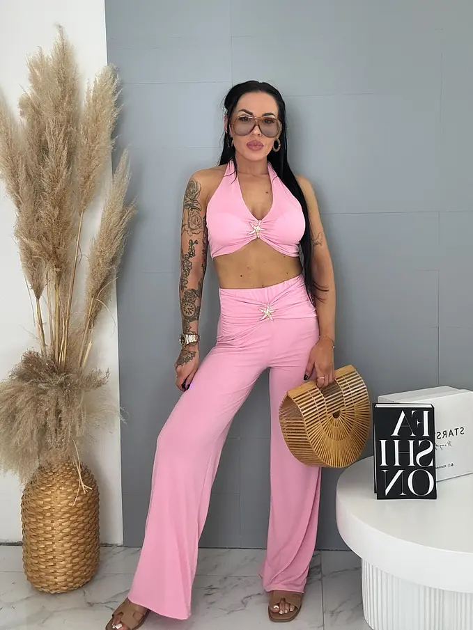 Čierny dámsky set s vystuženým vrchným dielom a zlatým zdobením, doplnený o nohavice s rovnakými zlatými detailmi.