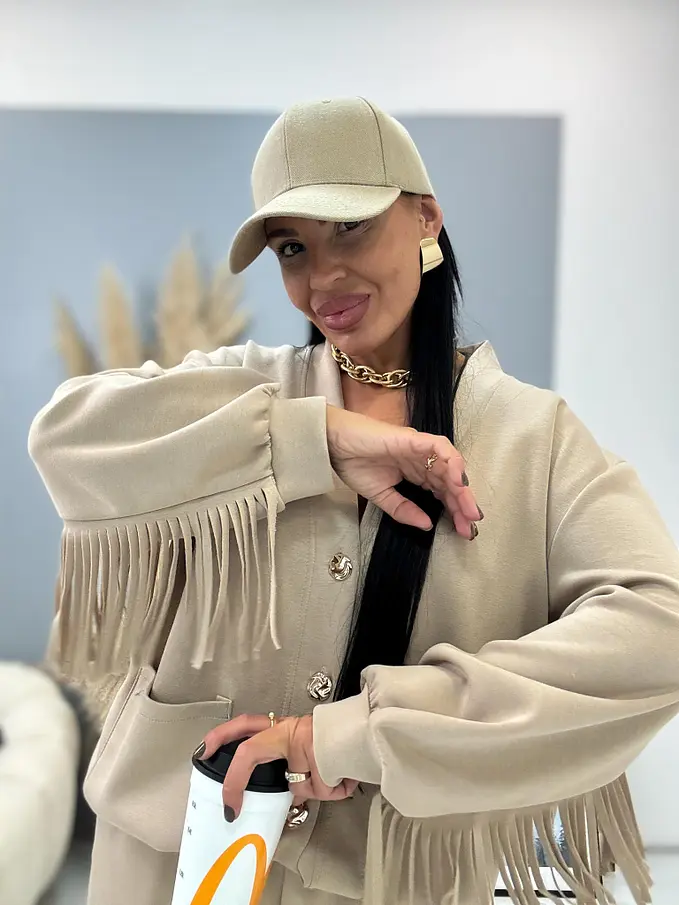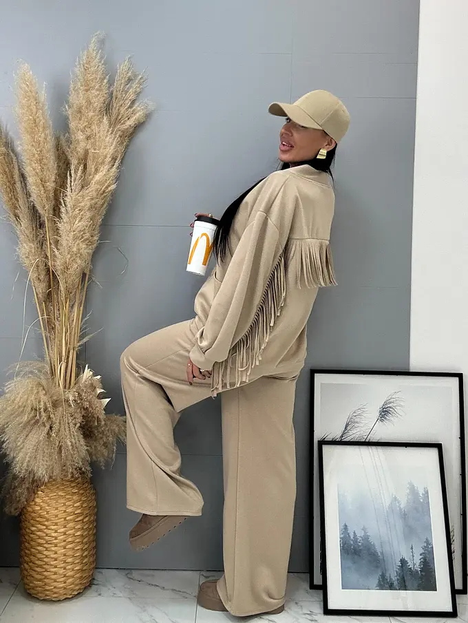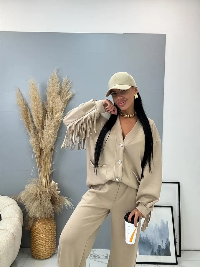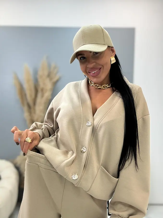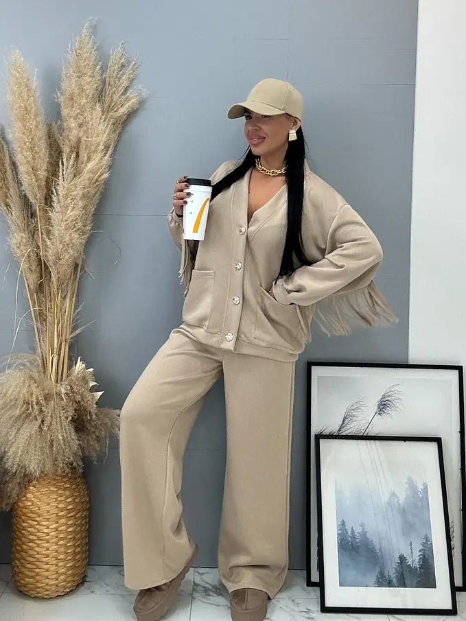 Dámský komplet z novej kolekcie. Pozozstáva z kardigánu s gombíkovou légou a nohavíc. Gombíky v striebornej farbe. Materiál je príjemný, elastický. Nohavice s gumeným pásom.