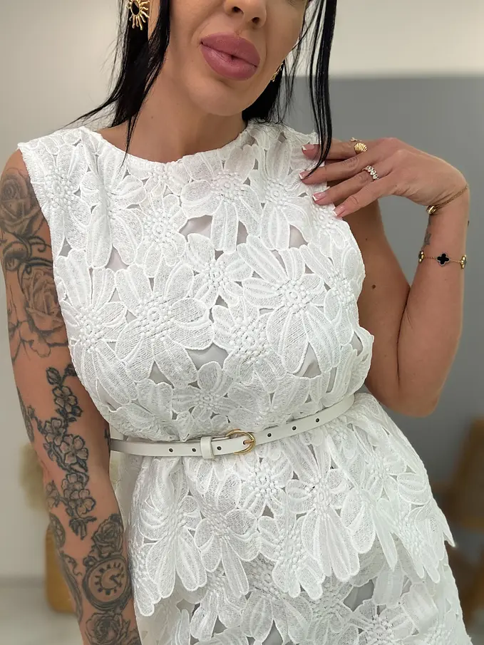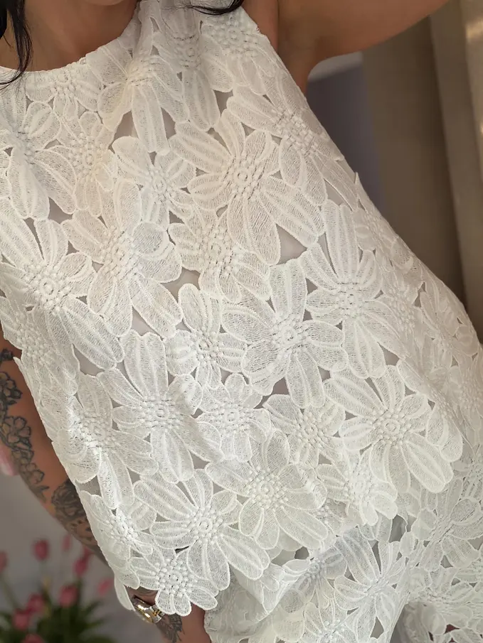 Modelka meria 164 cm a váží 57 kg. Má na sebe veľkosť S/M