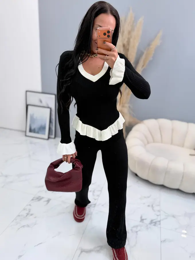Dámsky komplet z novej kolekcie. Pozozstáva z pulovra a nohavíc. Nohavice majú gumený pás. Materiál je príjemný, elastický. Ozdobená volánom.