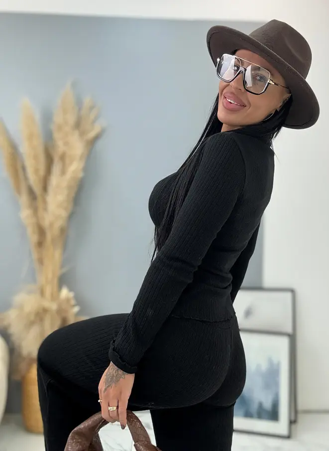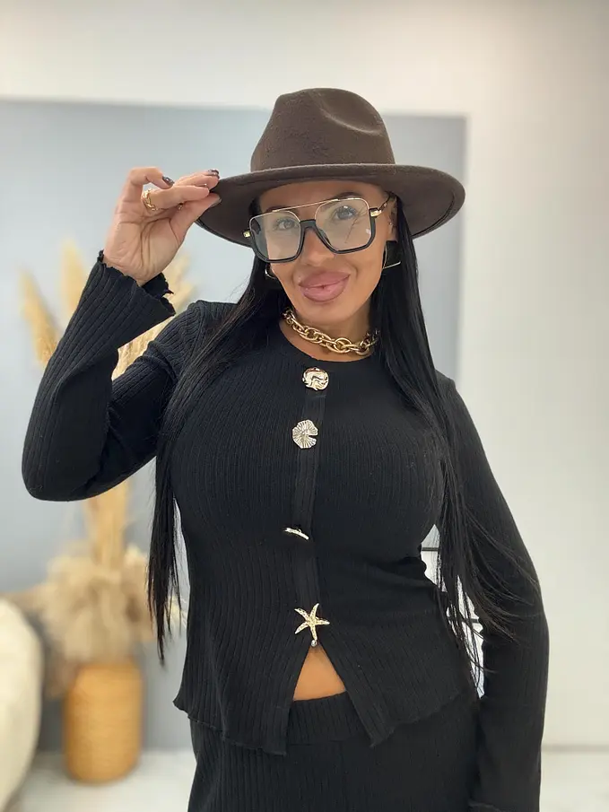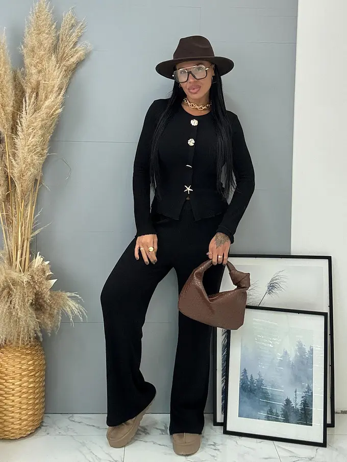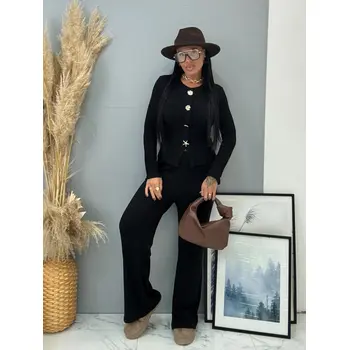 Dámsky komplet z novej kolekcie. Pozozstáva z pulovra a nohavíc. Nohavice majú gumený pás. Materiál je príjemný, elastický. Ozdoby majú zlatú farbu. Hviezdicová ozdoba je odnímateľná.