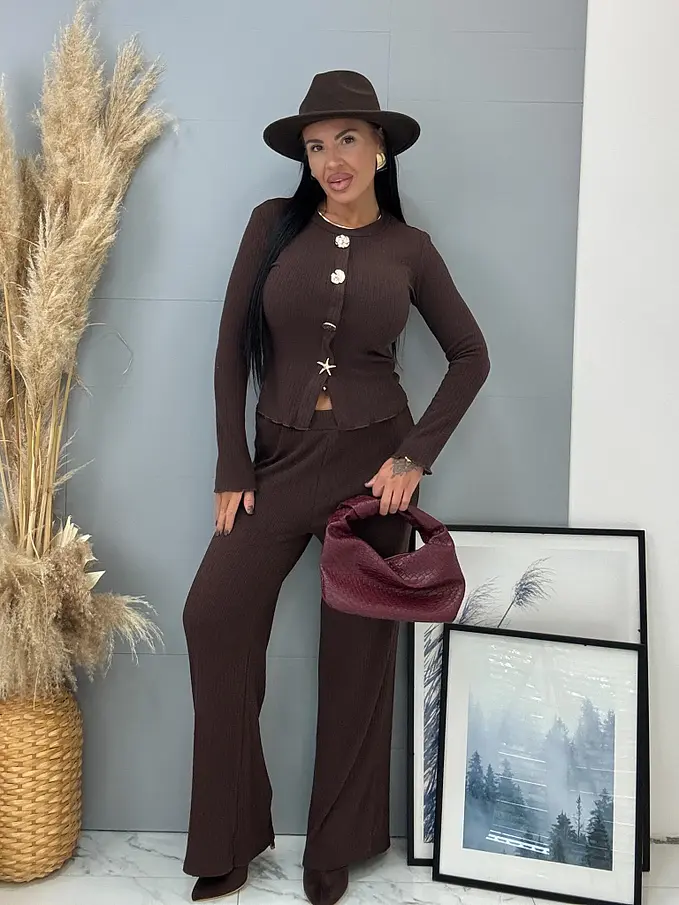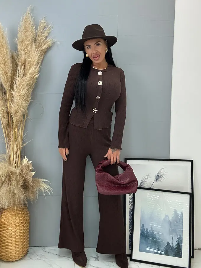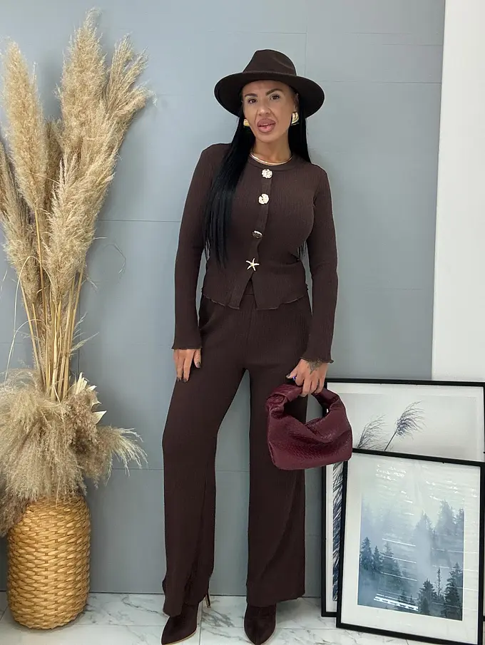 Dámsky komplet z novej kolekcie. Pozozstáva z pulovra a nohavíc. Nohavice majú gumený pás. Materiál je príjemný, elastický. Ozdoby majú zlatú farbu. Hviezdicová ozdoba je odnímateľná.