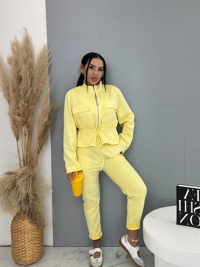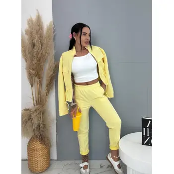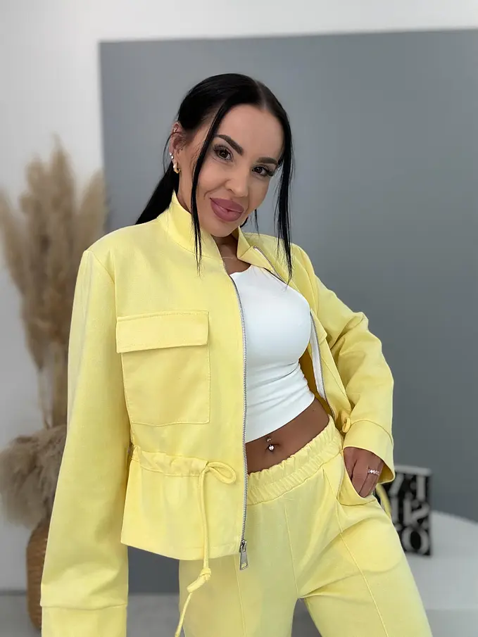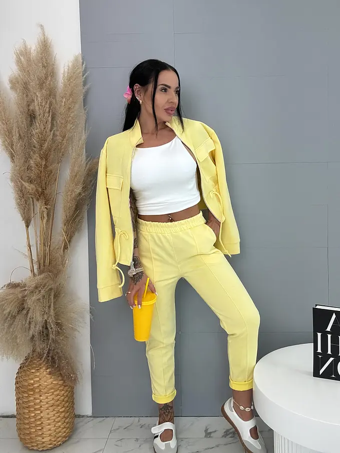 Dámský komplet z novej kolekcie. Pozostáva z mikiny so zipsom a nohavíc. Materiál je príjemný, elastický. Nohavice s gumeným pásom a bočnými vreckami. Mikina s prednými vreckami a viazaním v páse.