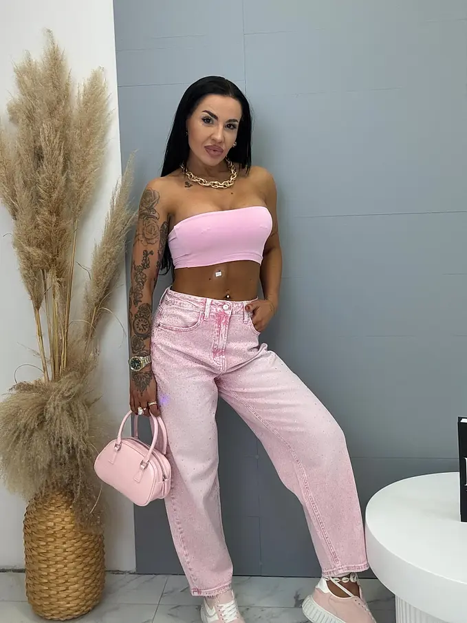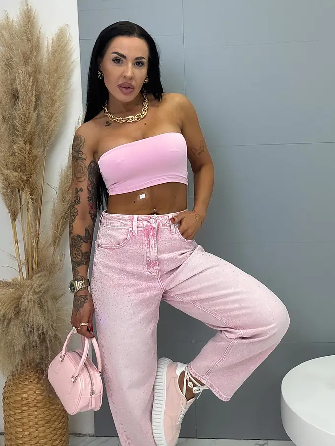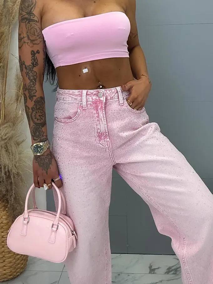 Džínsy s vysokým pásom zdobené kamienkami ROSE