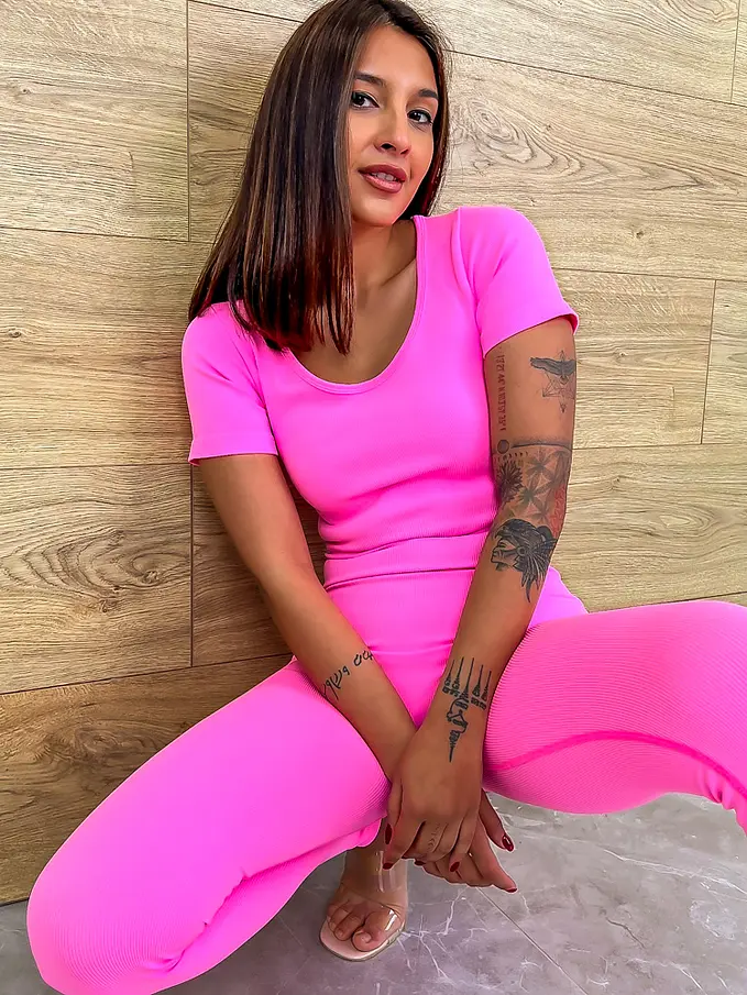 Modelka brunetka meria 158 cm a váží 50 kg. Nosí veľkosť XS.