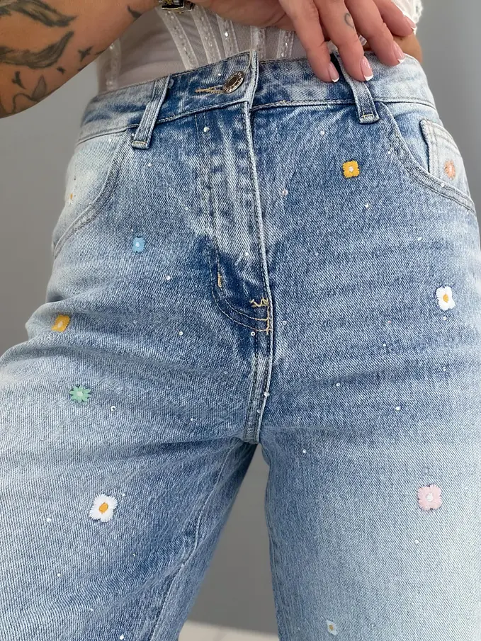 High Waist rifle s výšivkami a kamienkami