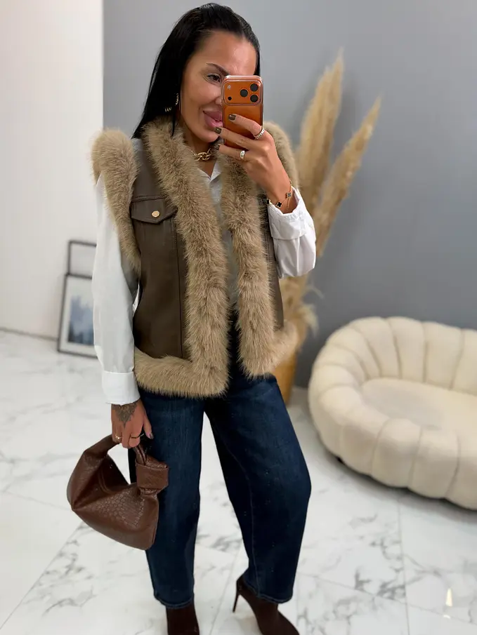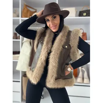 Kožená vesta s kožušinovým lemom. Podšitý mäkkým, príjemným kožúškom. Detaily sú v zlatej farbe. S bočnými vreckami v prednej časti. So sponovým zapínaním.
