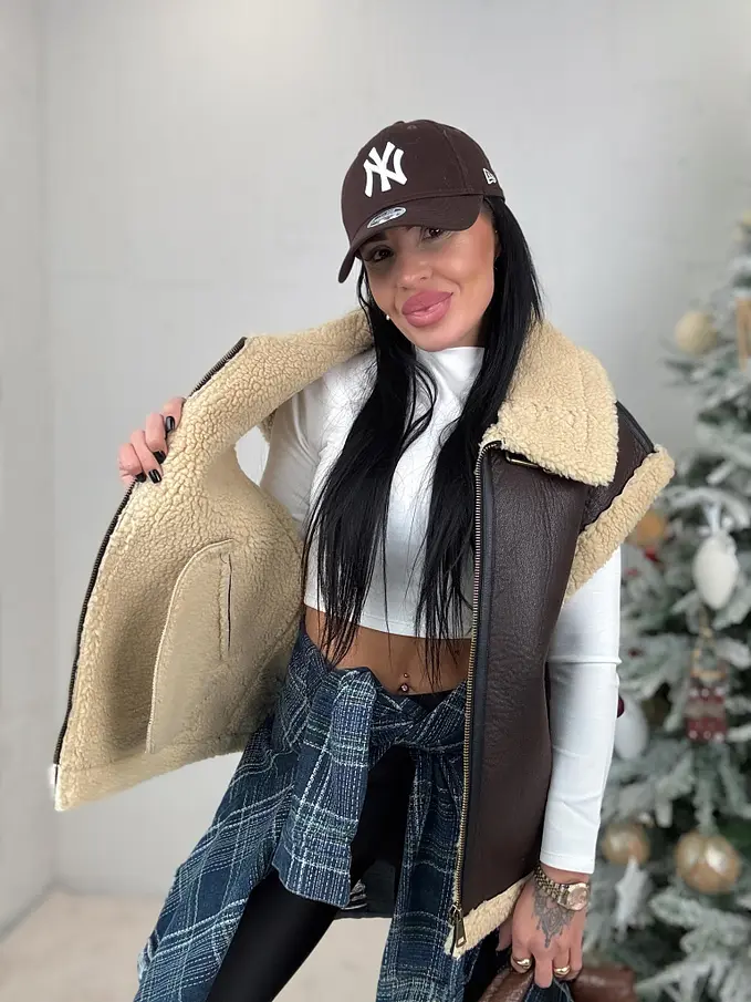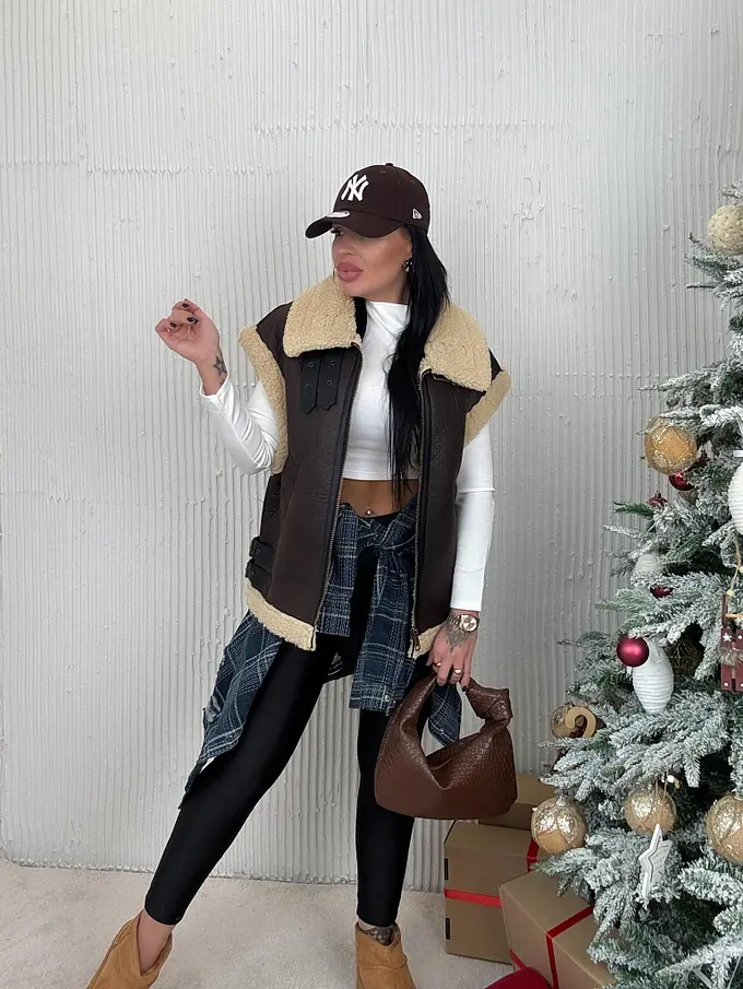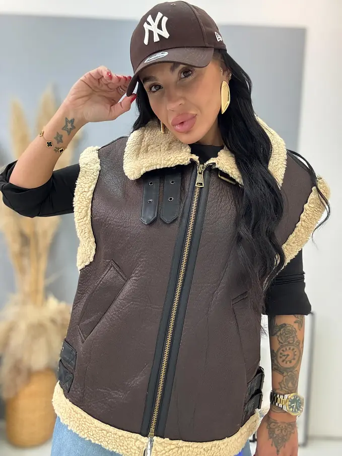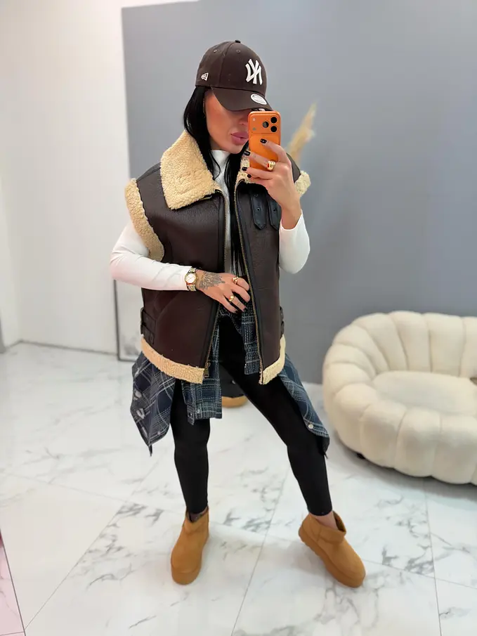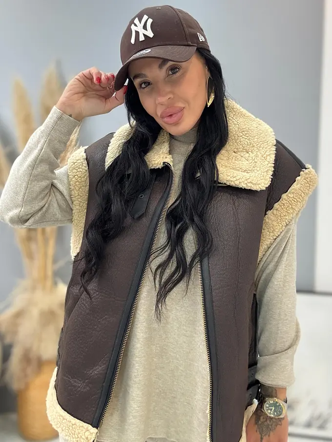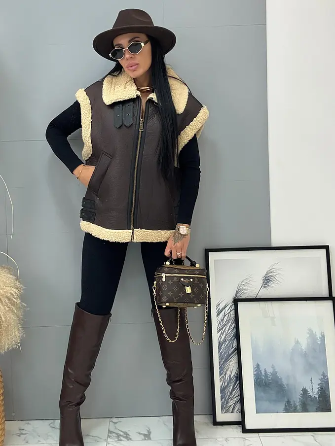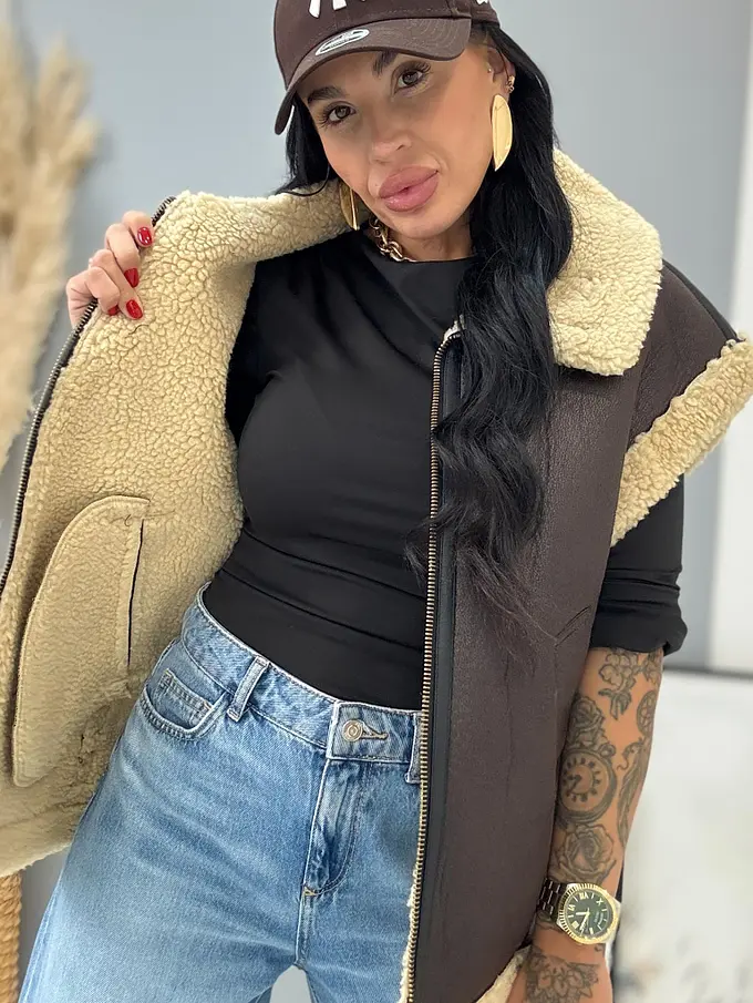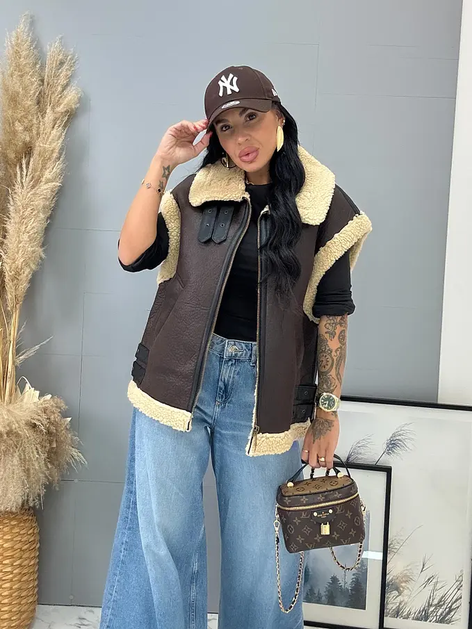 Vesta s kožušinovým lemom. Podšitý mäkkým, príjemným kožúškom. Detaily sú v zlatej farbe. S bočnými vreckami v prednej časti.