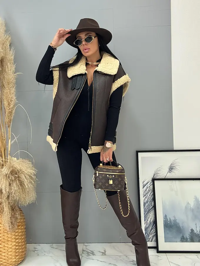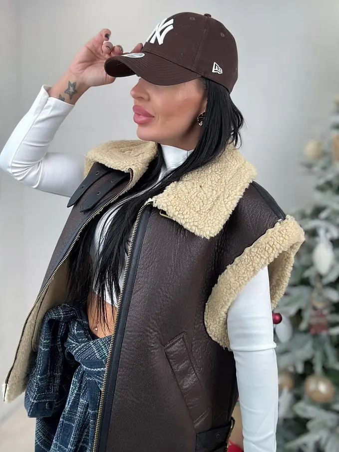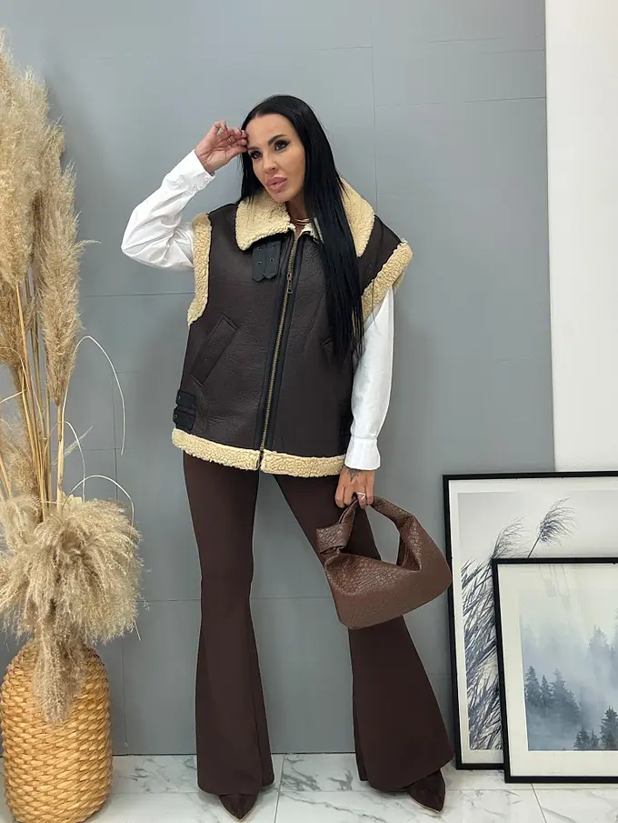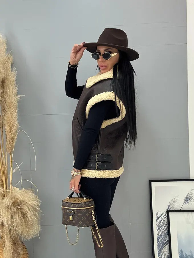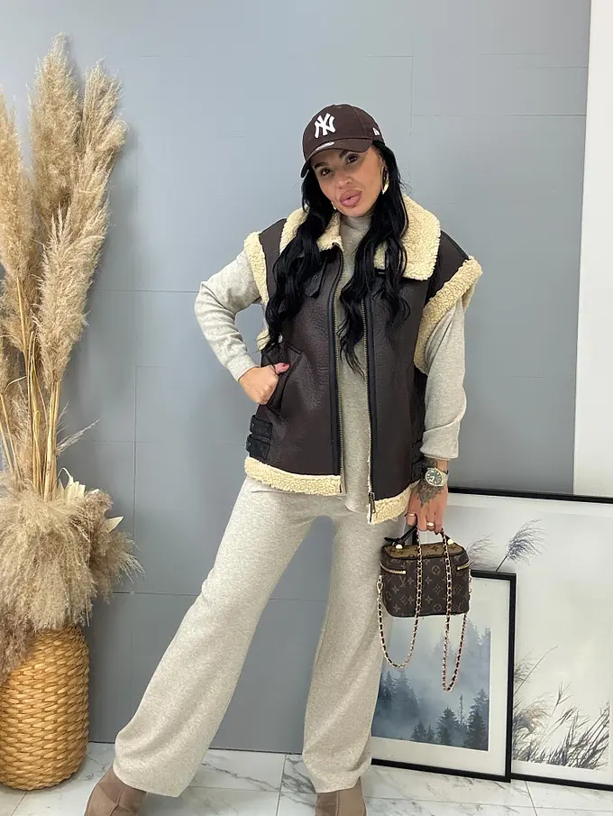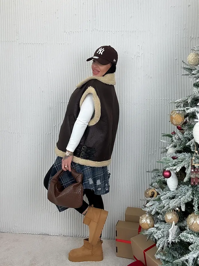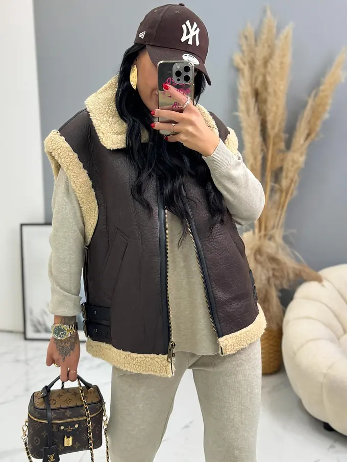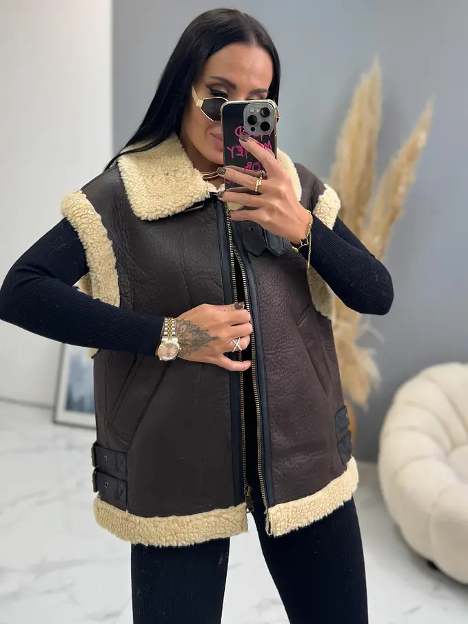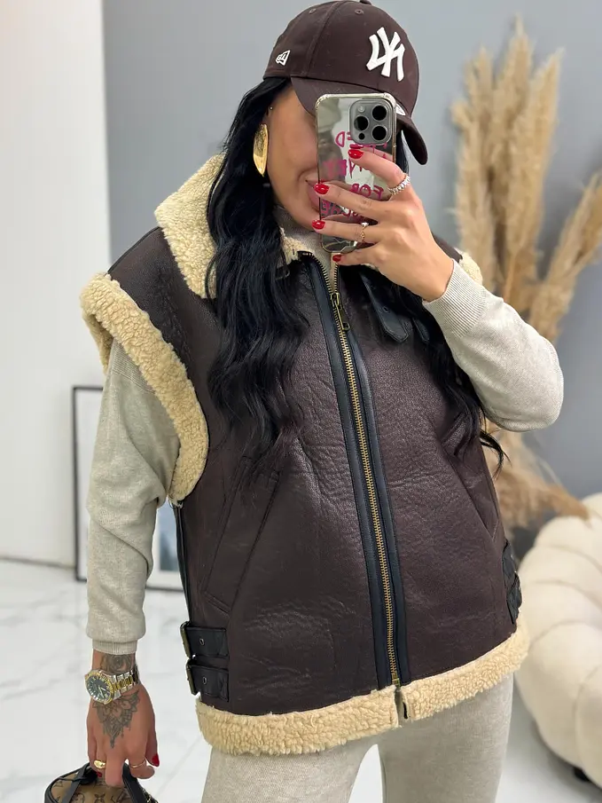 Vesta s kožušinovým lemom. Podšitý mäkkým, príjemným kožúškom. Detaily sú v zlatej farbe. S bočnými vreckami v prednej časti.