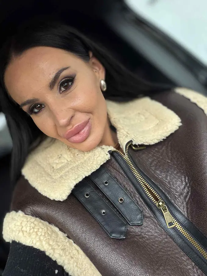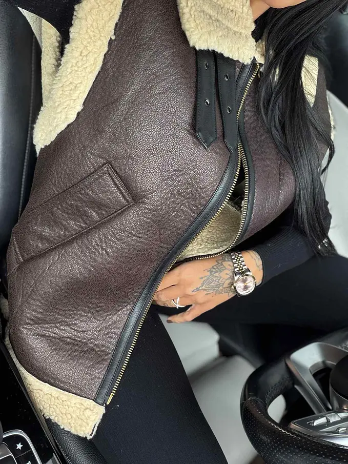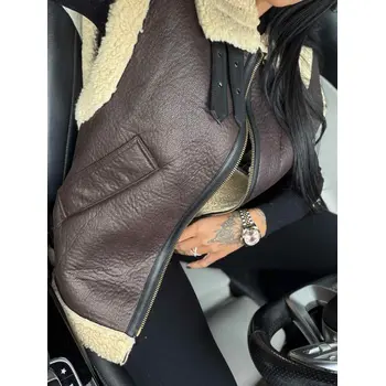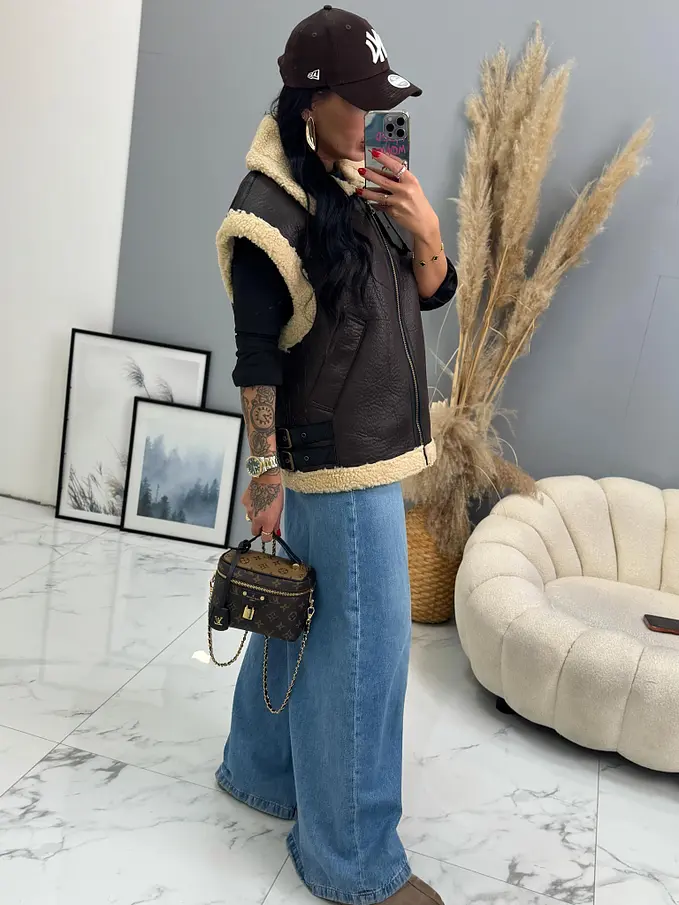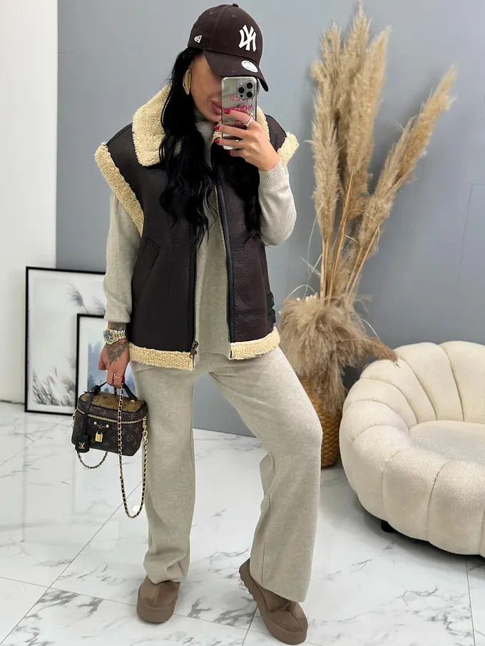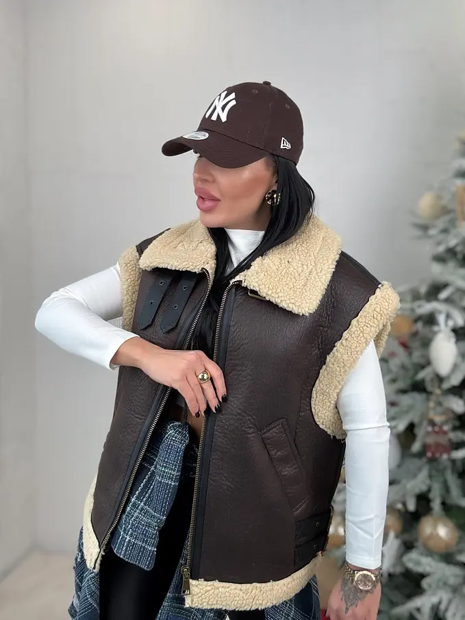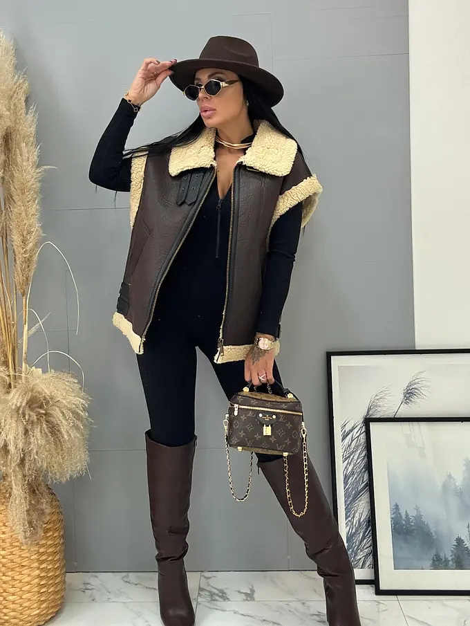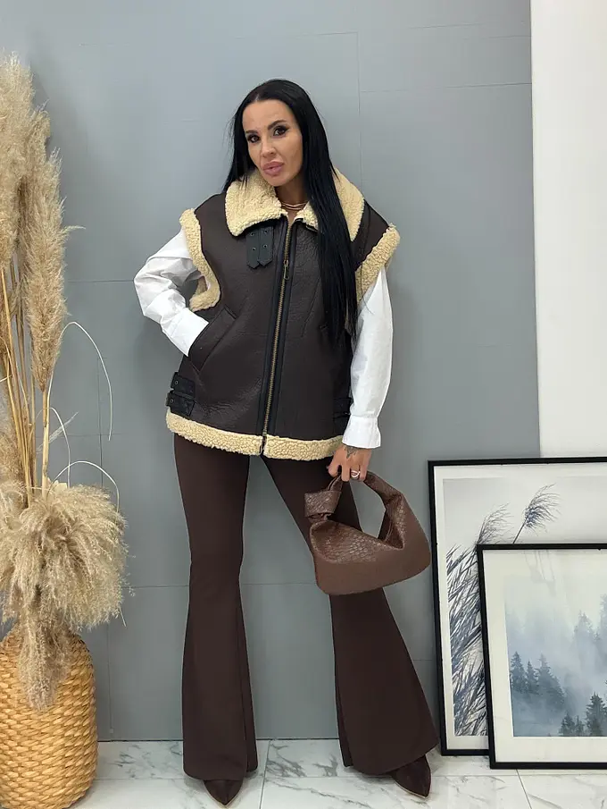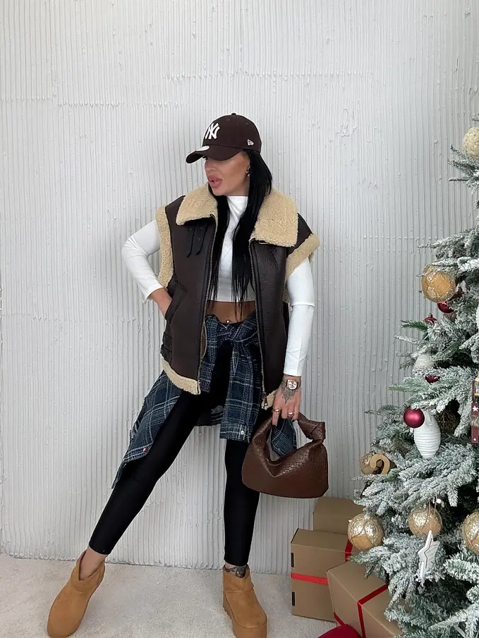 Vesta s kožušinovým lemom. Podšitý mäkkým, príjemným kožúškom. Detaily sú v zlatej farbe. S bočnými vreckami v prednej časti.