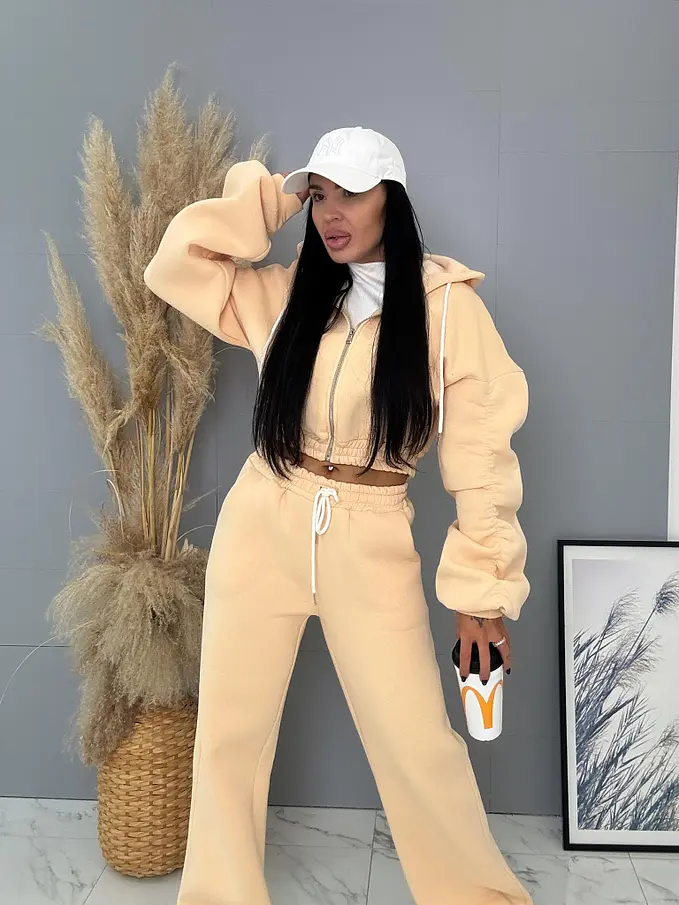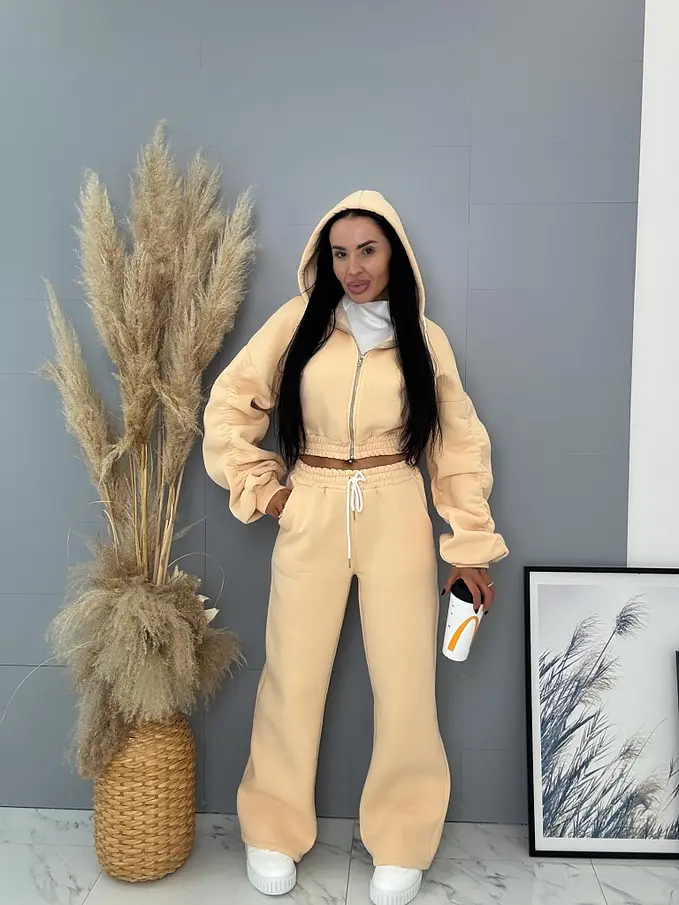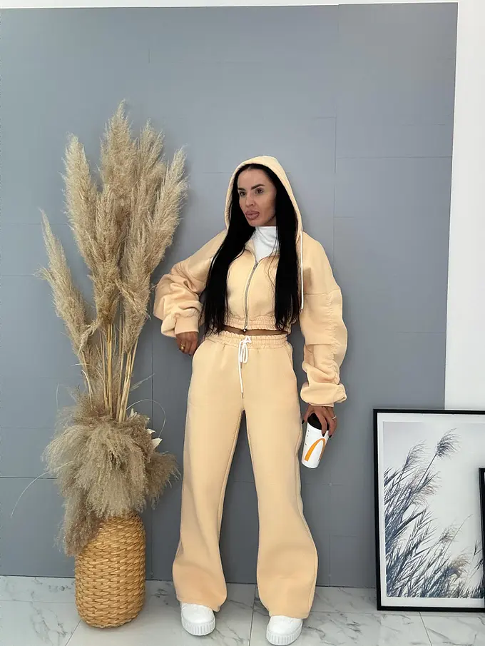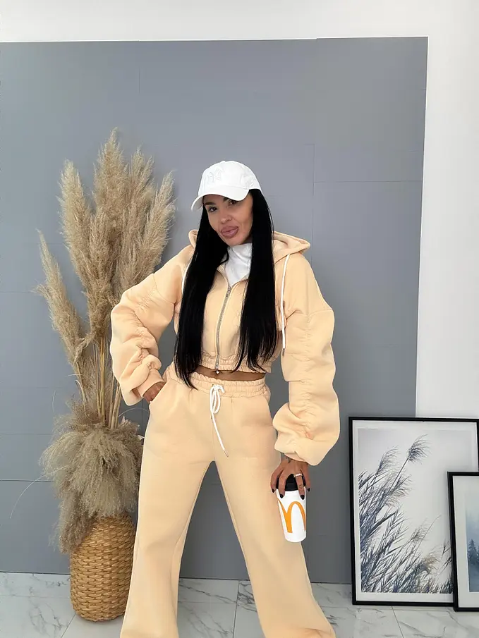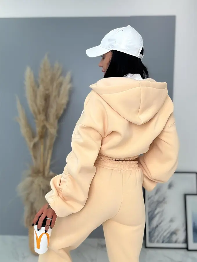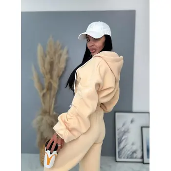 Dámsky komplet z novej kolekcie. Pozostáva z mikiny a nohavíc. Nohavice majú gumený pás. Materiál je príjemný, elastický, teplý.