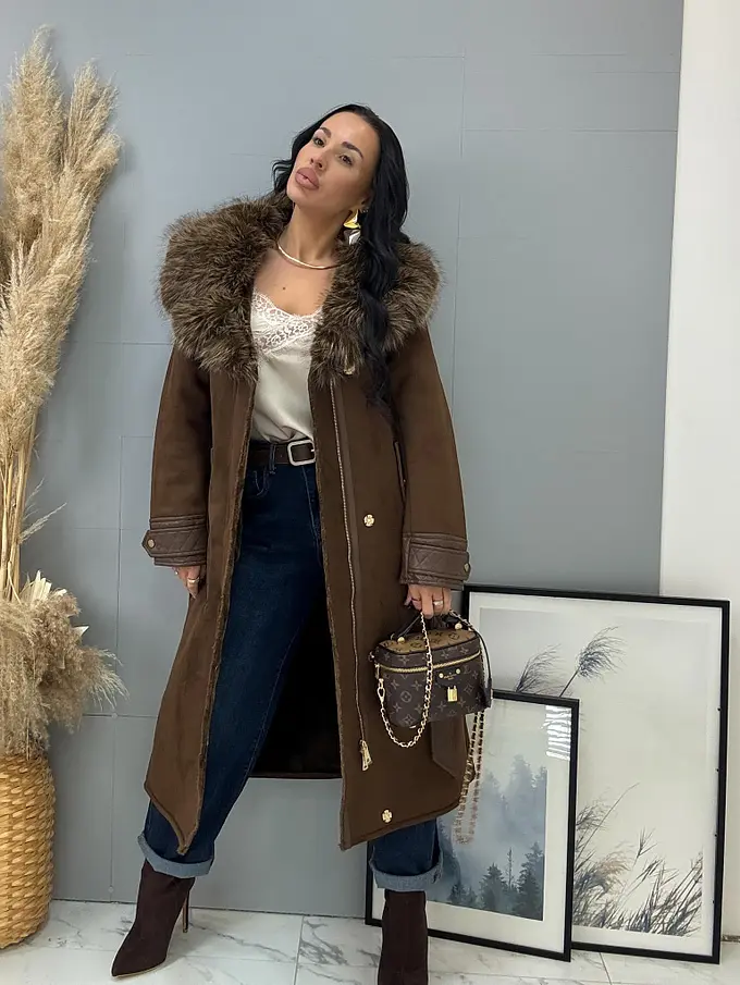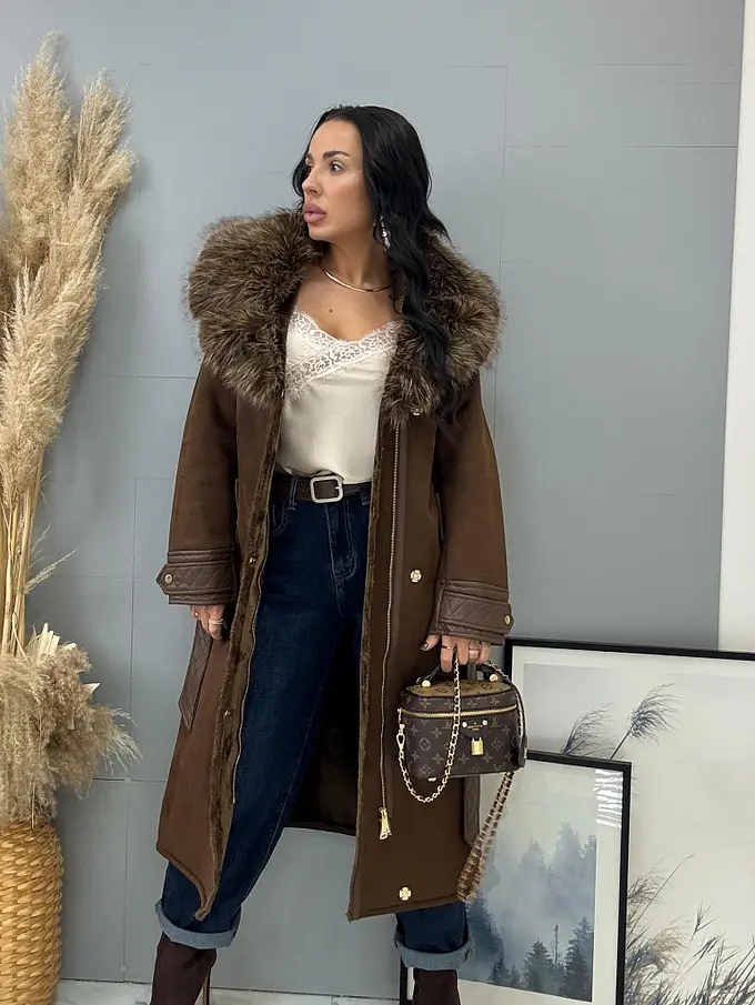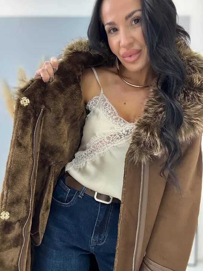 Kombinovaná bunda s neodnímateľným kožušinovým lemom na golieri. Podšitý mäkkým, príjemným kožúškom. Detaily sú v zlatej farbe. S bočnými vreckami.
