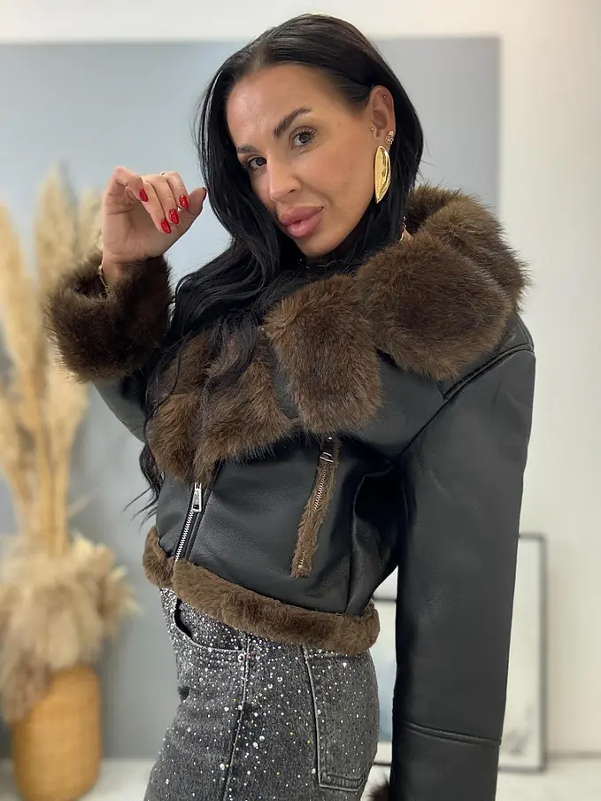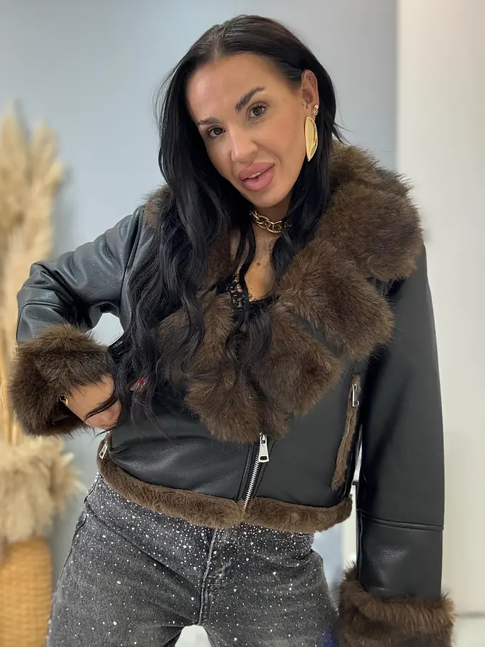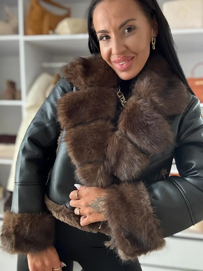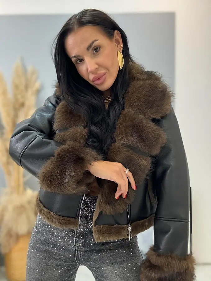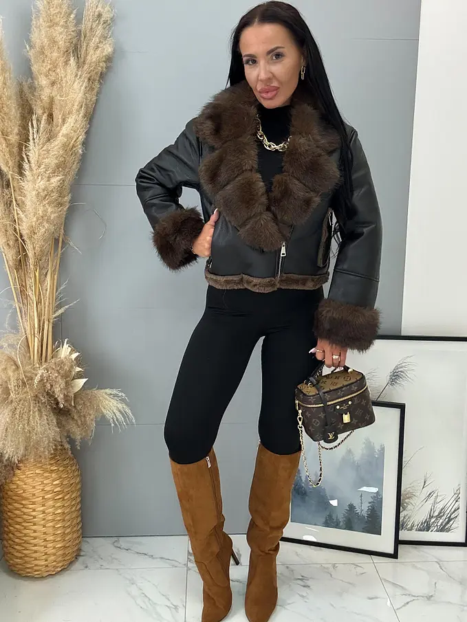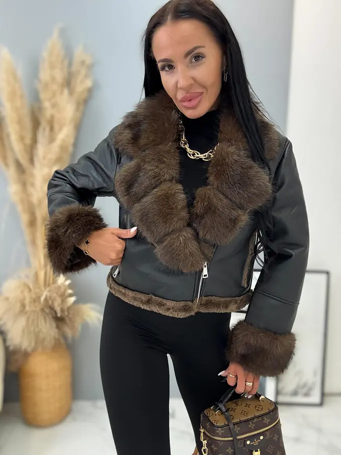 Kožená bunda s neodnímateľným kožušinovým lemom na golieri a rukávoch. Podšitý mäkkým, príjemným kožúškom. Detaily sú v stribornej farbe. S bočnými vreckami.
