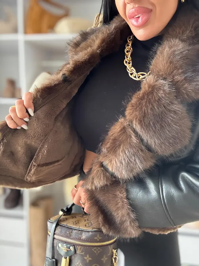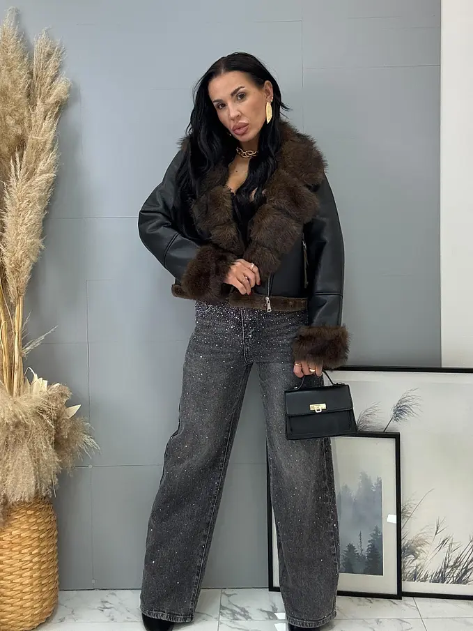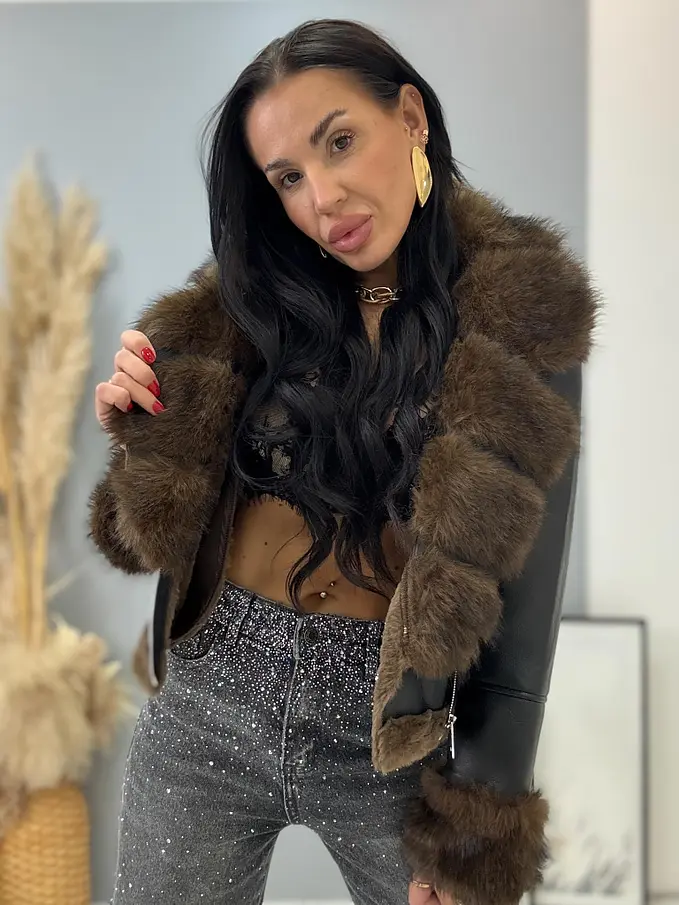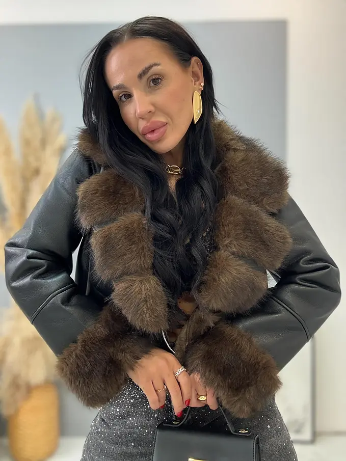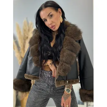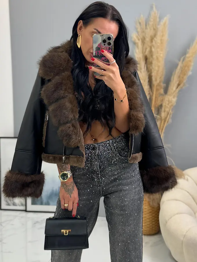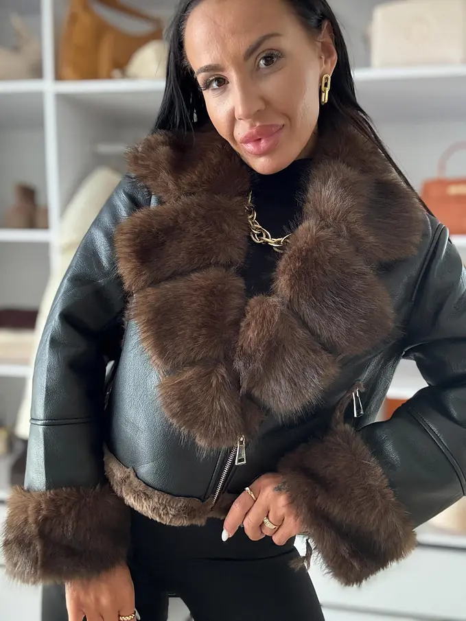 Kožená bunda s neodnímateľným kožušinovým lemom na golieri a rukávoch. Podšitý mäkkým, príjemným kožúškom. Detaily sú v stribornej farbe. S bočnými vreckami.