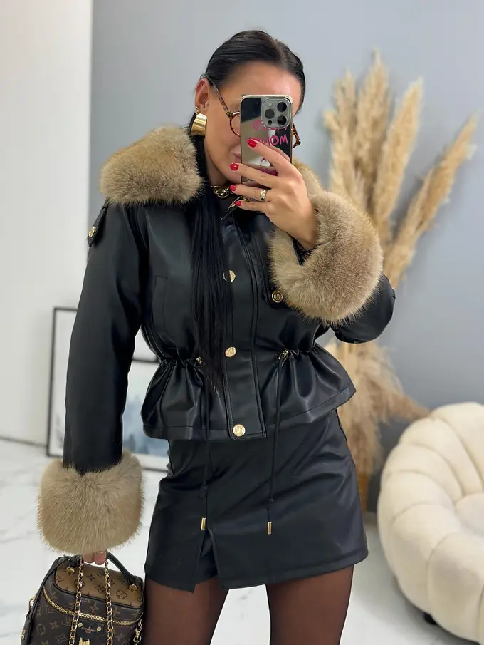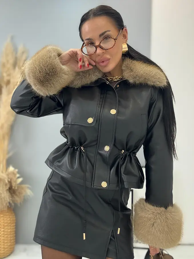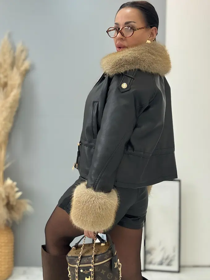 Kožená bunda s odnímateľným kožušinovým lemom na golieri a rukávoch. Podšitý mäkkým, príjemným kožúškom. Detaily sú v zlatej farbe. S bočnými vreckami.