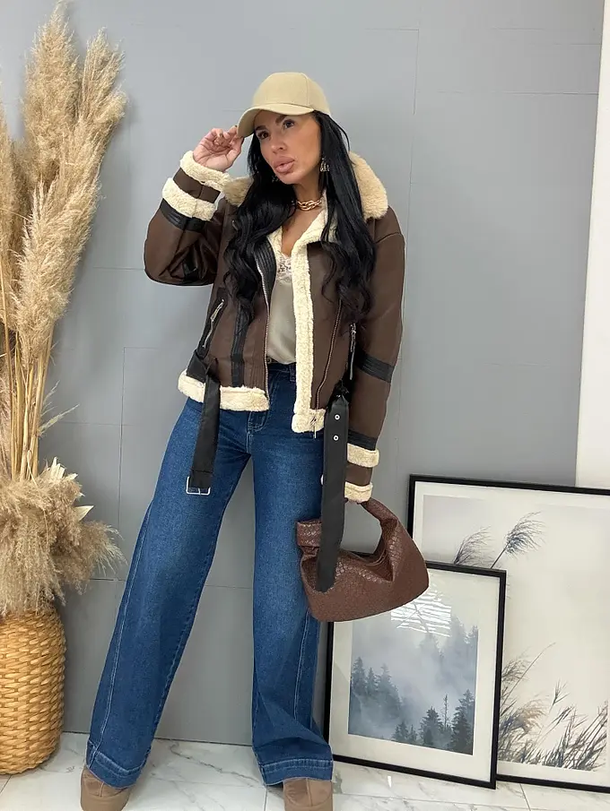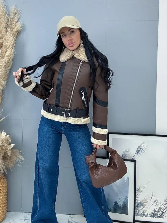 Kožená bunda s neodnímateľným kožušinovým lemom na golieri a rukávoch. Podšitý mäkkým, príjemným kožúškom. Detaily sú v stribornej farbe. S bočnými vreckami.