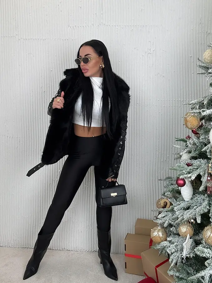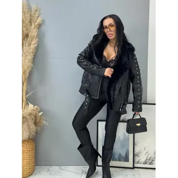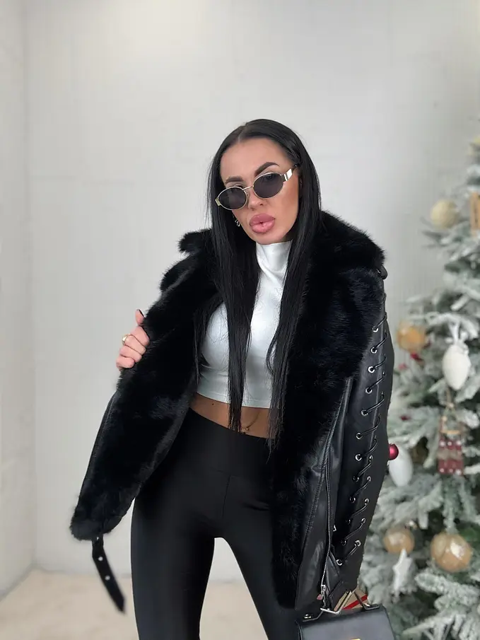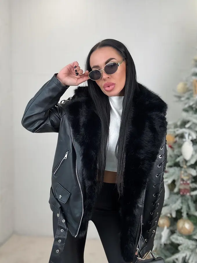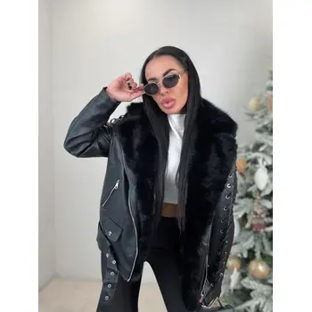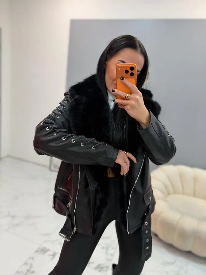 Kožená bunda s odnímateľným kožušinovým lemom na golieri. Podšitý mäkkým, príjemným kožúškom. Detaily sú v stribornej farbe. S bočnými vreckami.