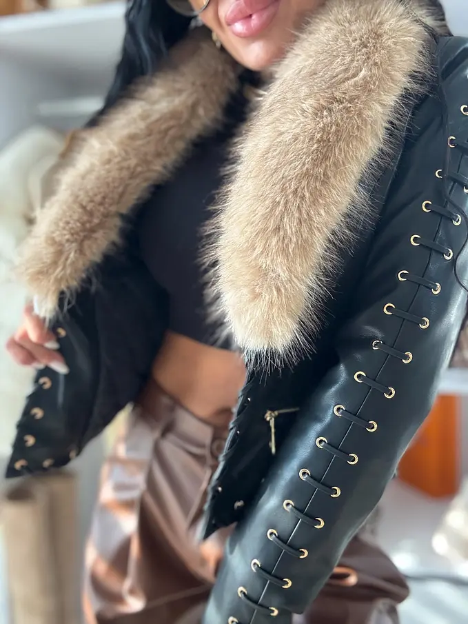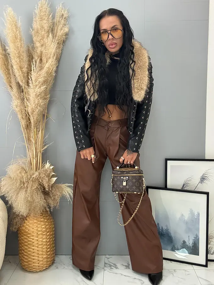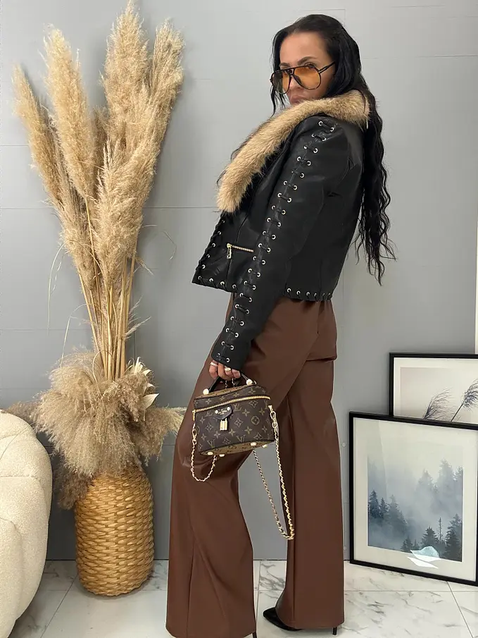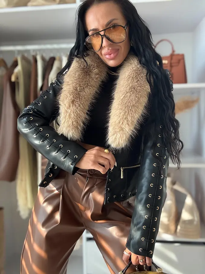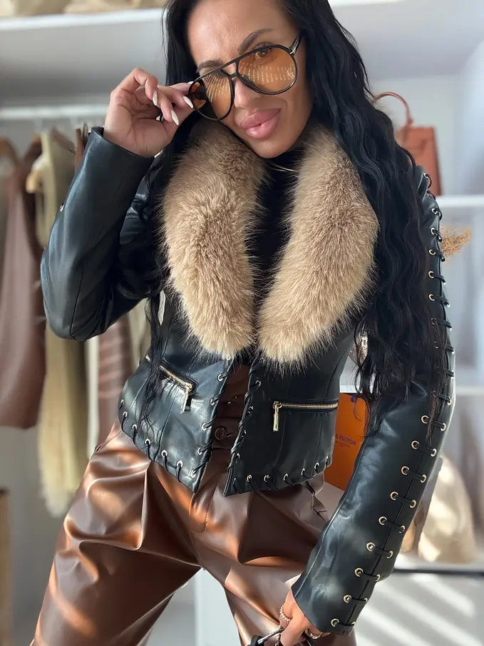 Kožená bunda s odnímateľným kožušinovým lemom na golieri. Detaily sú v zlatej farbe. Vreckami na prednej strane.