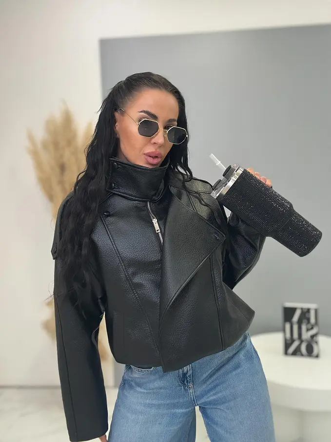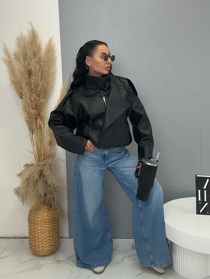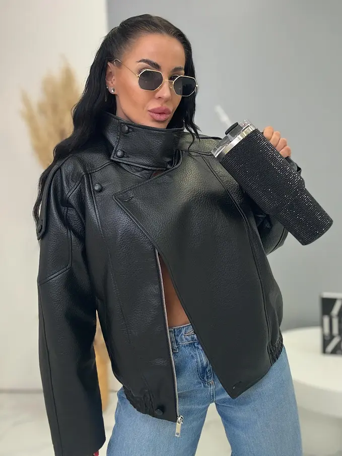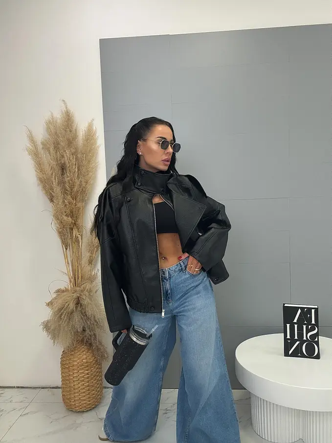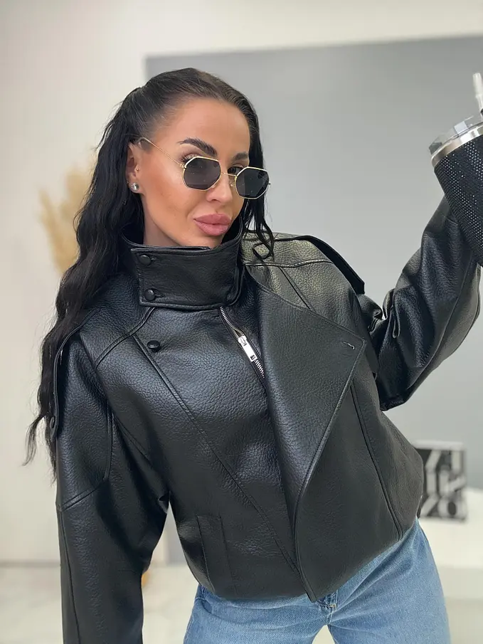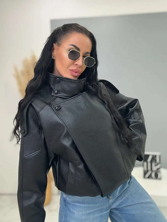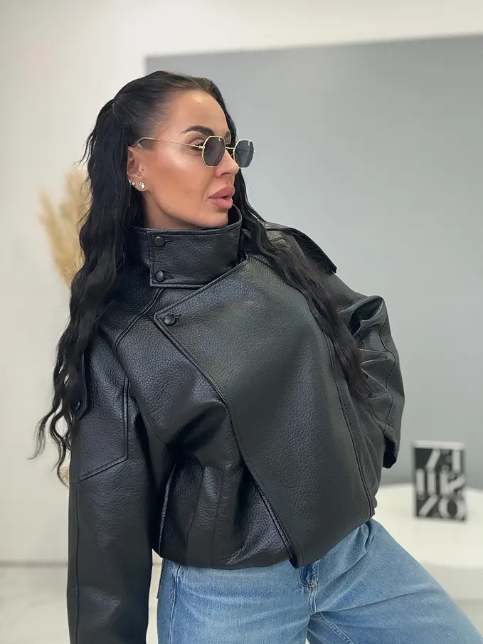 Kožená bunda s golierom a bomber strihom. Má praktické bočné vrecká a elastický lem. Zapína sa na gombíky a zlatý zips. Material nie je elastický, s podšívkou.