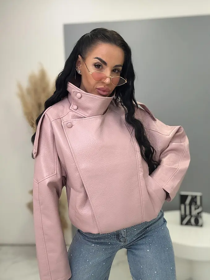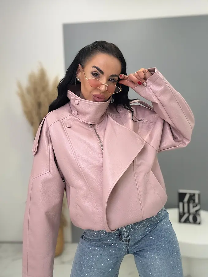 Kožená bunda s golierom a bomber strihom. Má praktické bočné vrecká a elastický lem. Zapína sa na gombíky a zlatý zips. Material nie je elastický, s podšívkou.