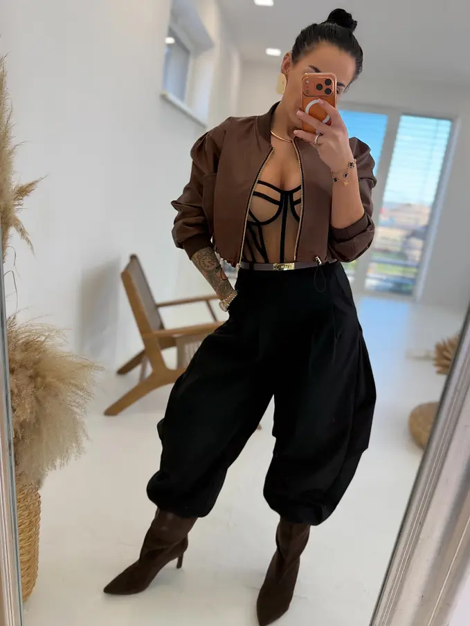 Krátka koženková bunda. Zips je zlatej farby. Spodnú časť bundy je možné natiahnúť.