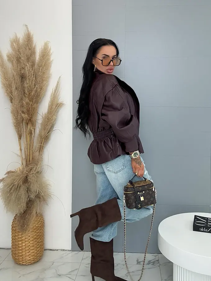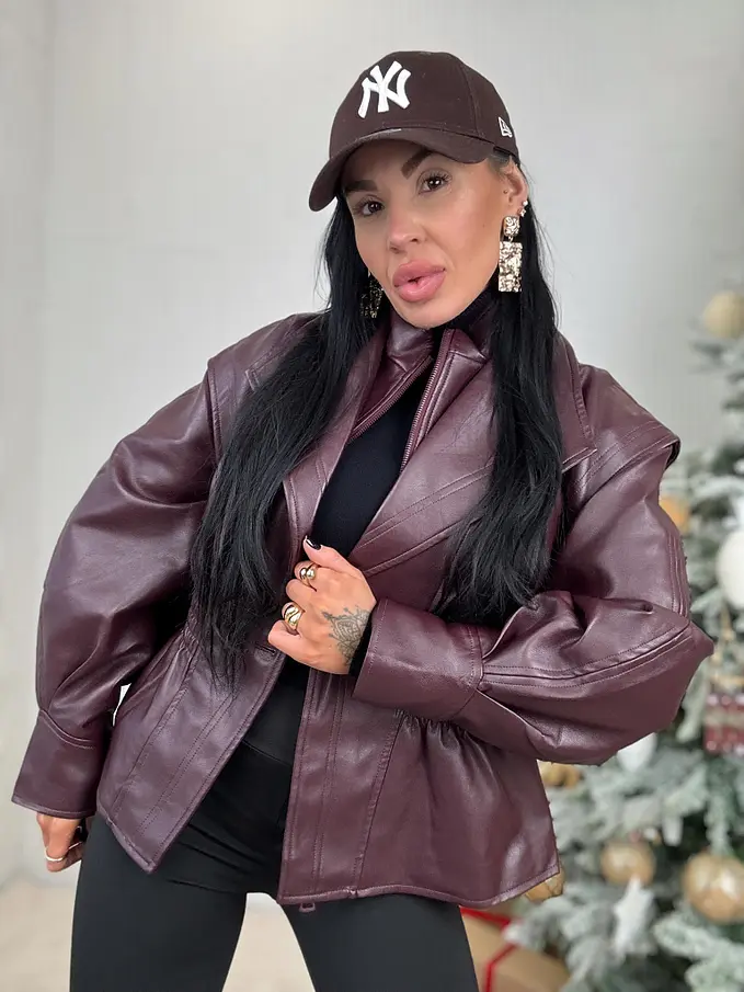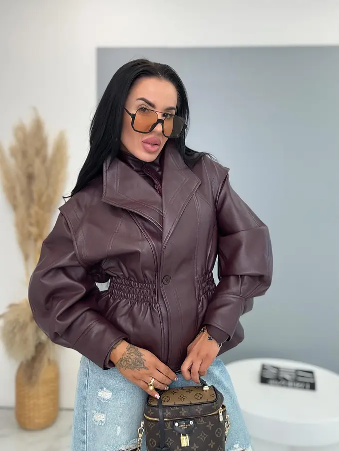 Krátka koženková bunda. Detaily sú v čiernej farbe a gumeným pásom.