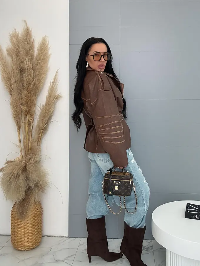 Krátka koženková bunda. Vpredu má funkčné vrecká. Detaily sú v stribornej farbe.