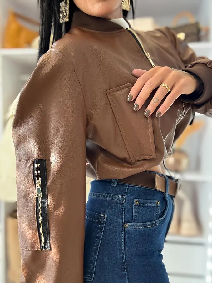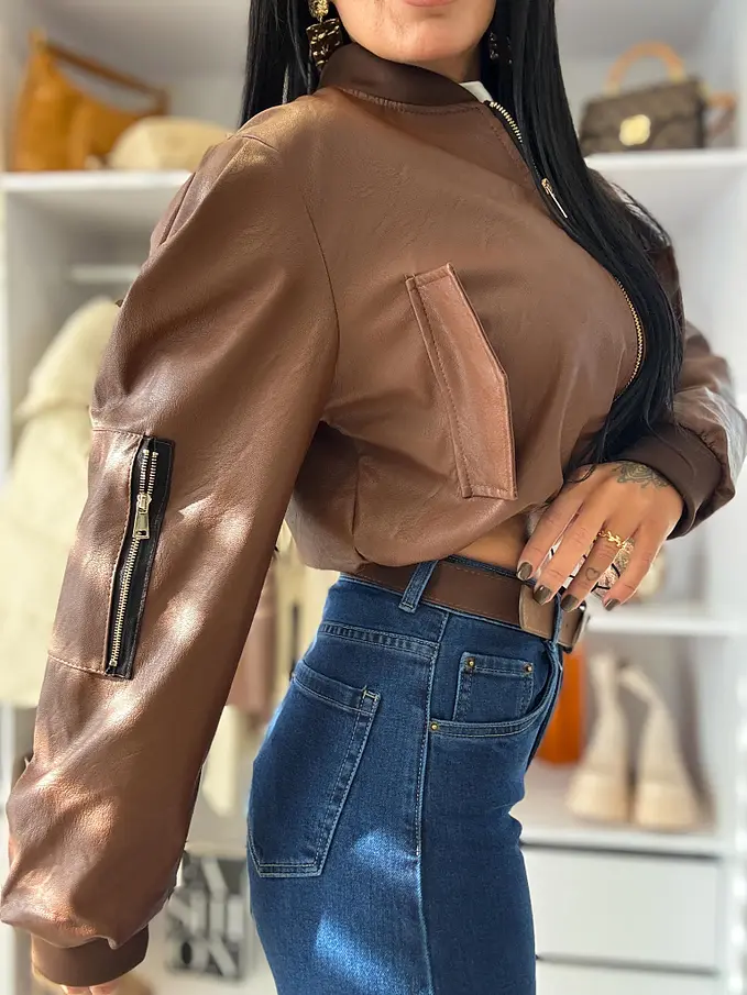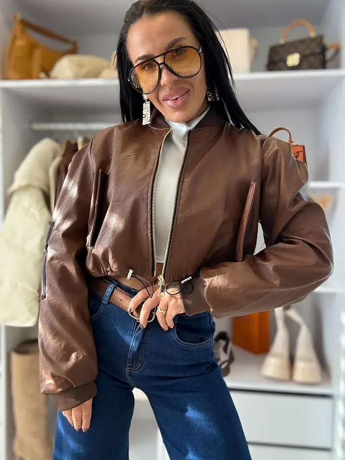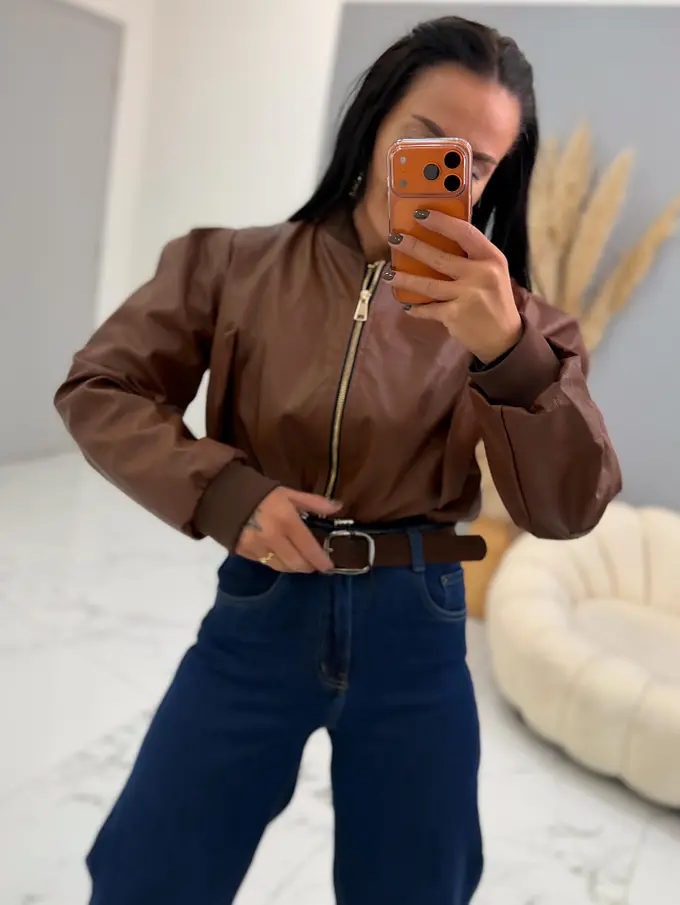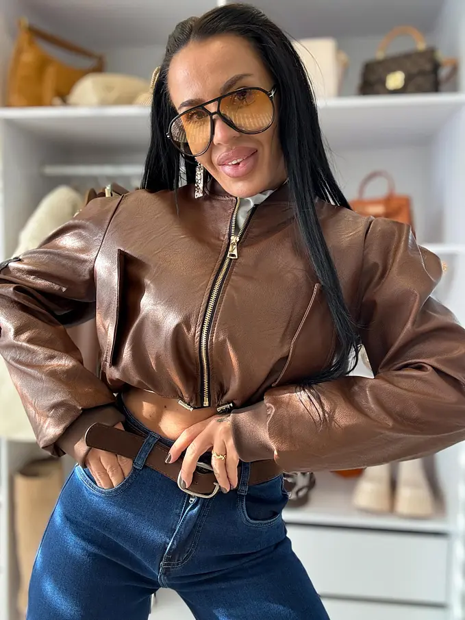 Krátka koženková bunda. Zips je zlatej farby. Spodnú časť bundy je možné natiahnúť.