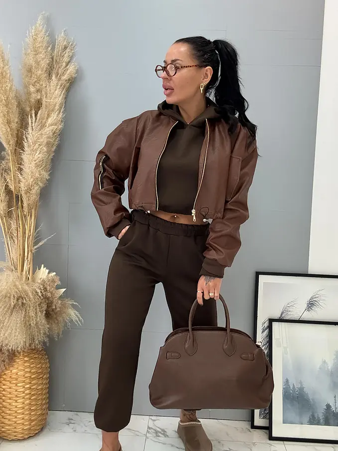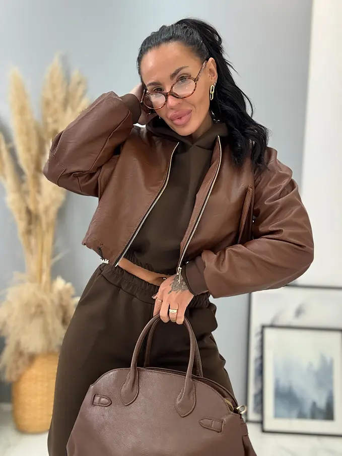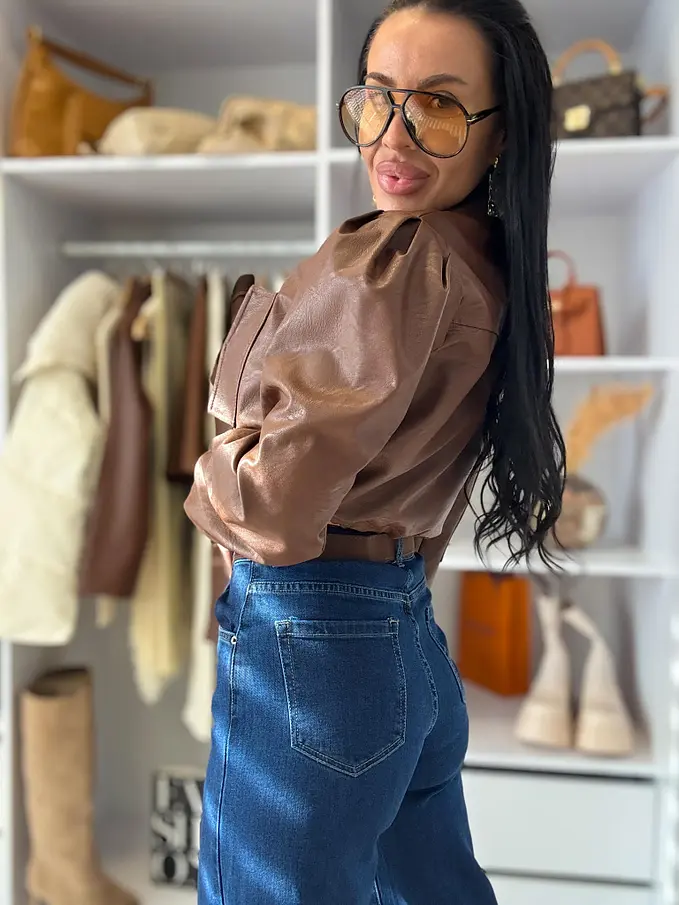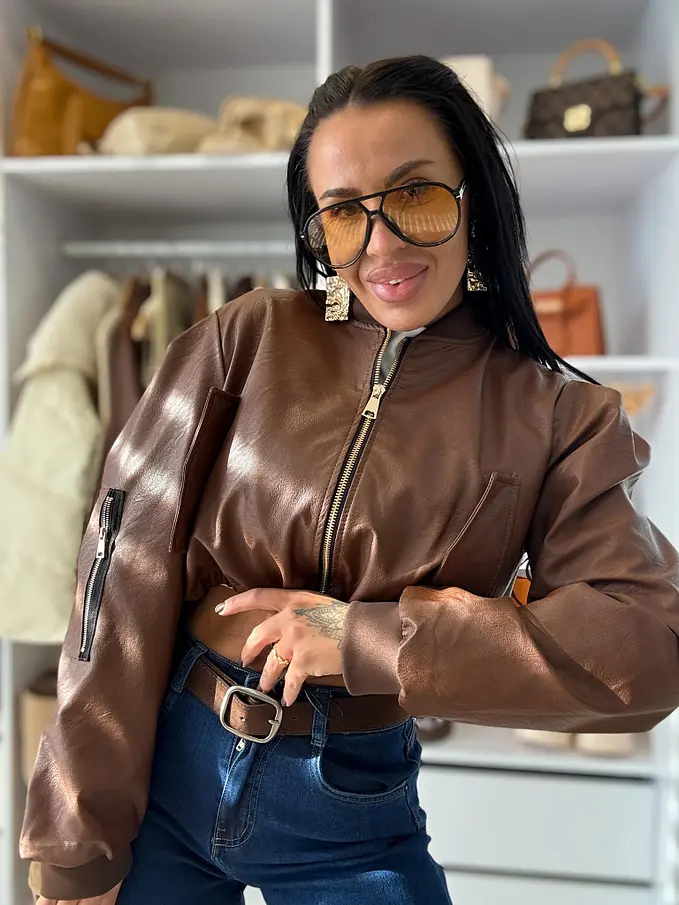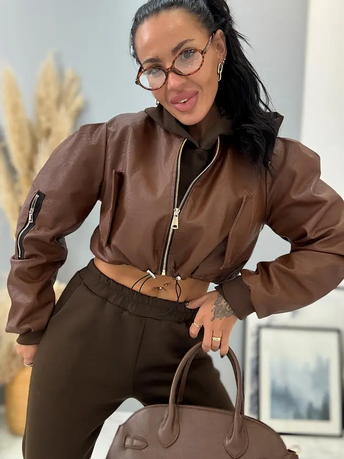 Krátka koženková bunda. Zips je zlatej farby. Spodnú časť bundy je možné natiahnúť.