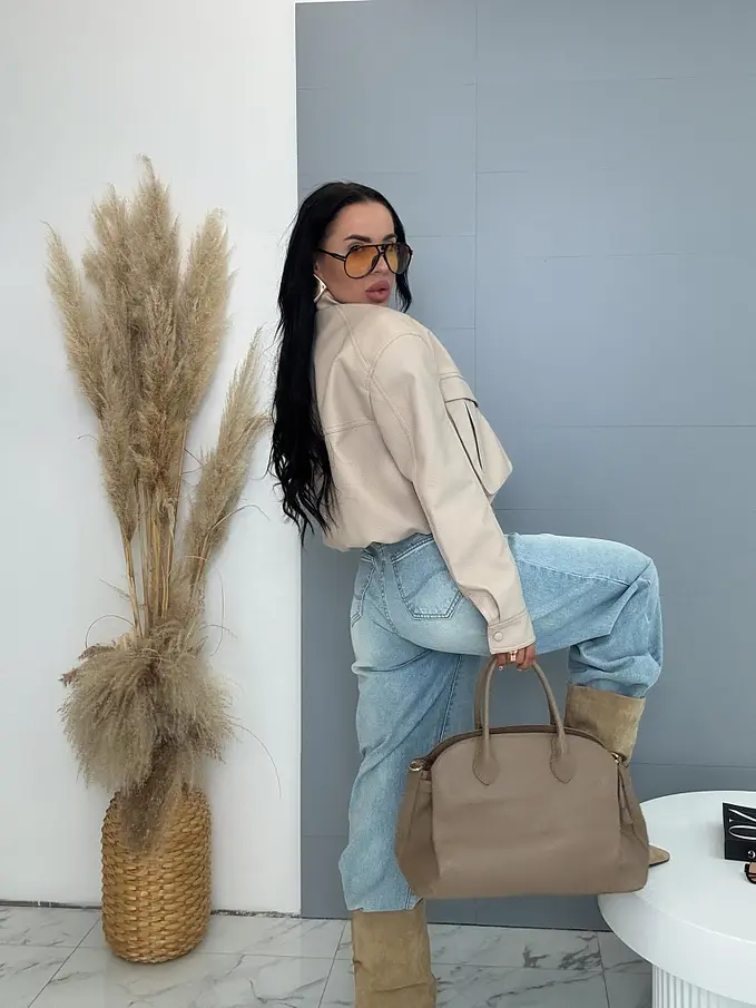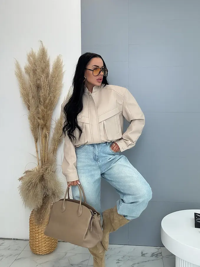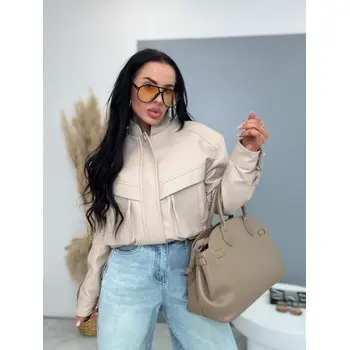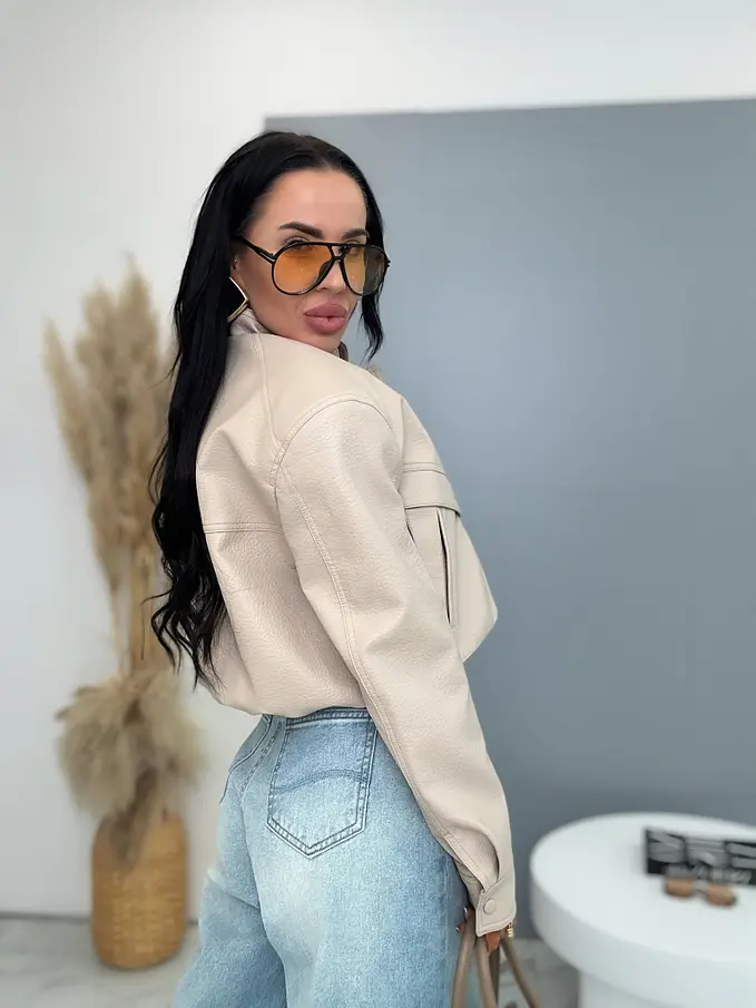 Krátka koženková bunda s vypchávkami. Detaily sú v striebornej farbe. Gumeným pásom a bočnými vreckami.