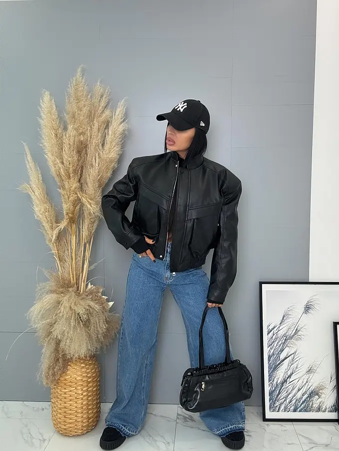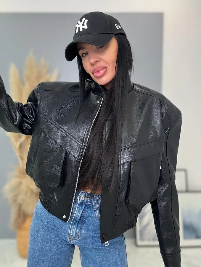 Krátka koženková bunda s vypchávkami. Detaily sú v striebornej farbe. Gumeným pásom a bočnými vreckami.