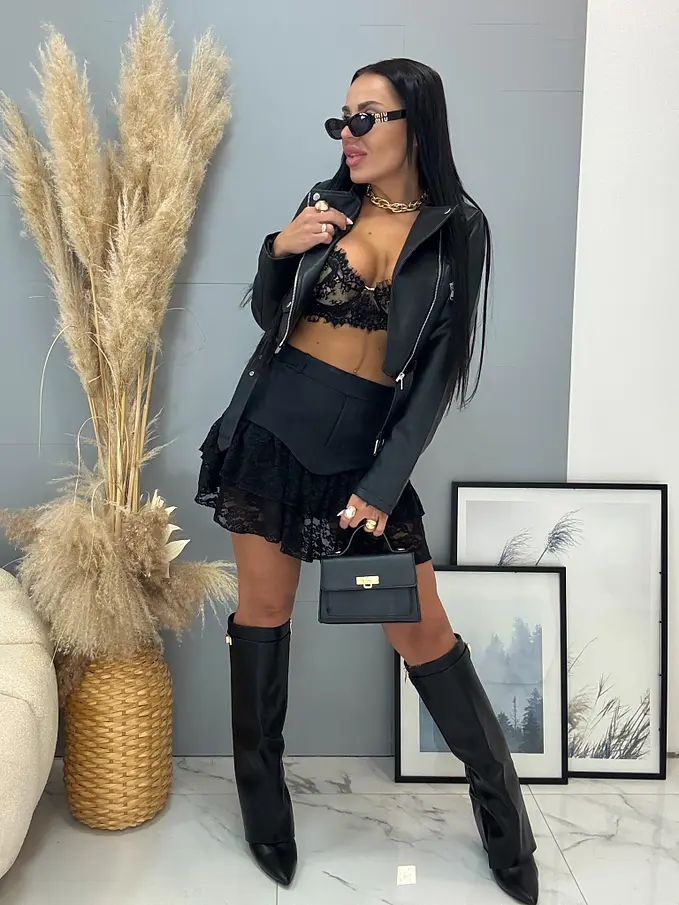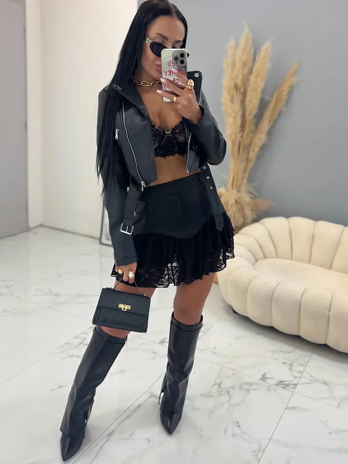 Volánová sukňa s gumeným pásom. S vnútornými šortkami. Volány sú z čipky.