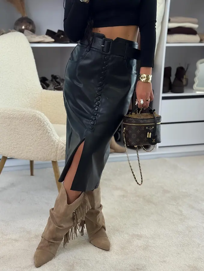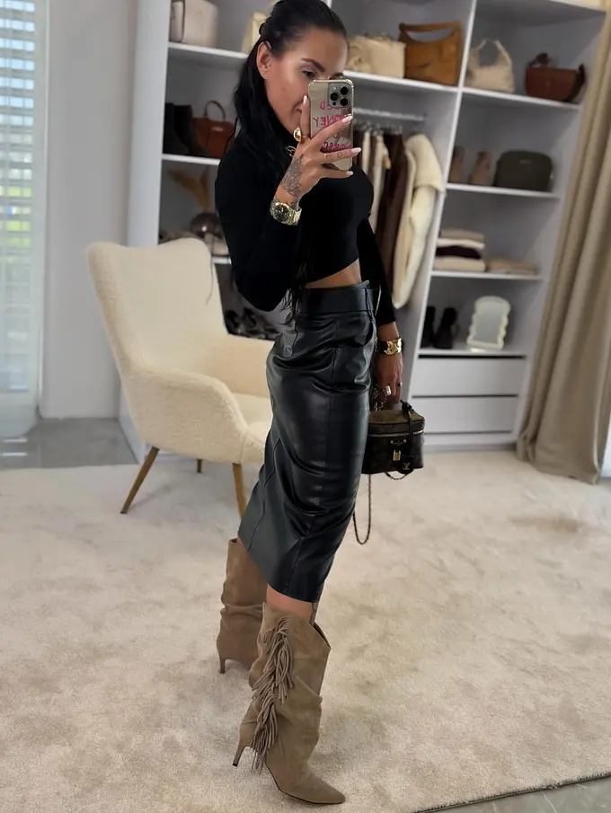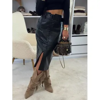 Koženková sukňa z novej kolekcie. Vyrobená z minimálne elastického materiálu. Zapínanie na zips vzadu. S vreckami. Materiál: 64% polyurethane, 36% polyester