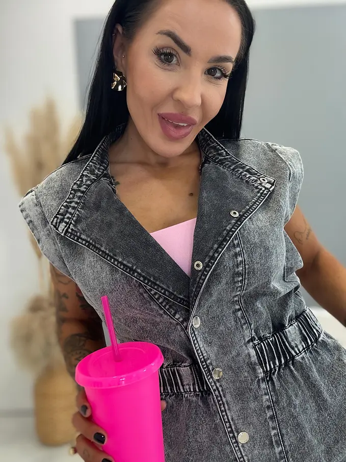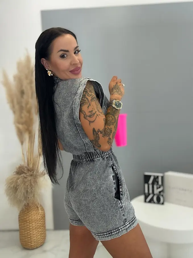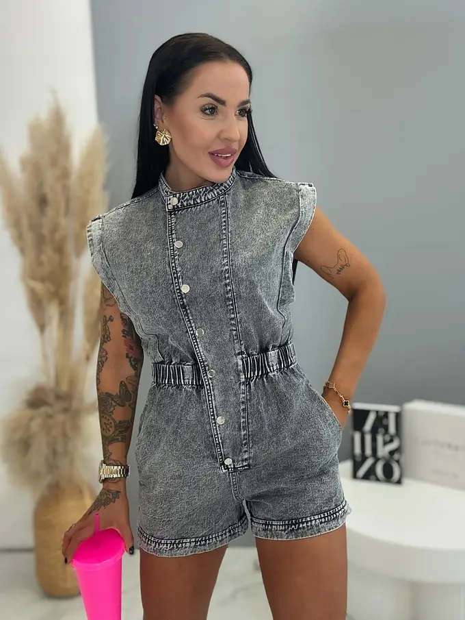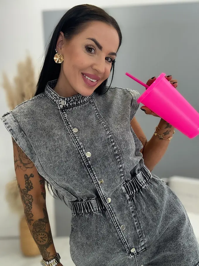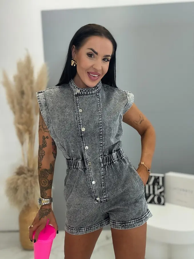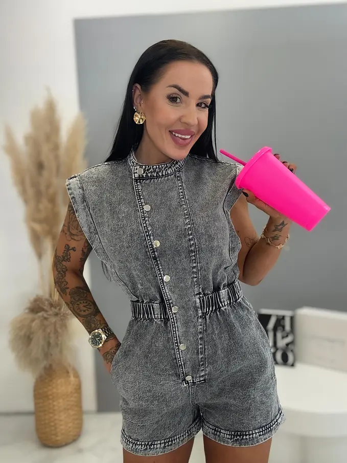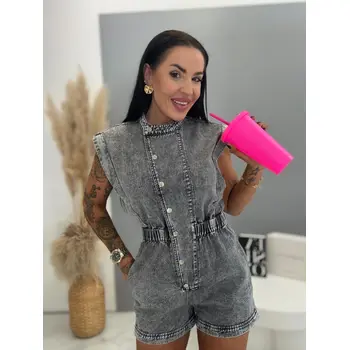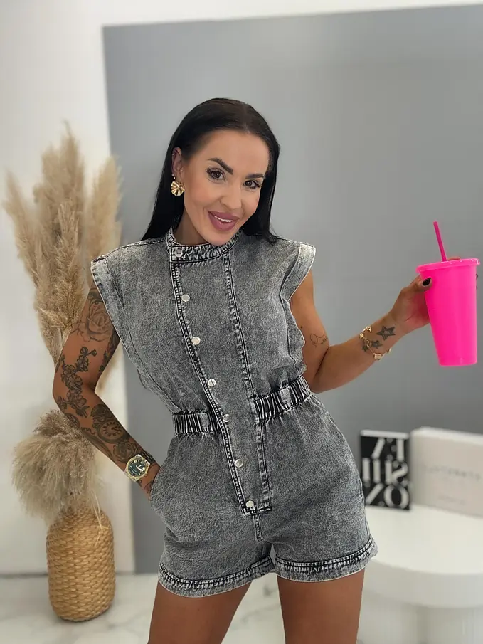 Overal s krátkymi rukávmi a golierom predstavuje moderný a zároveň praktický kúsok vhodný do každého šatníka. Zapínanie na strieborné cvoky zabezpečuje pohodlné obliekanie a dodáva modelu nenápadný dizajnový prvok. Bočné vrecká dajú väčší komfort pri nosení.