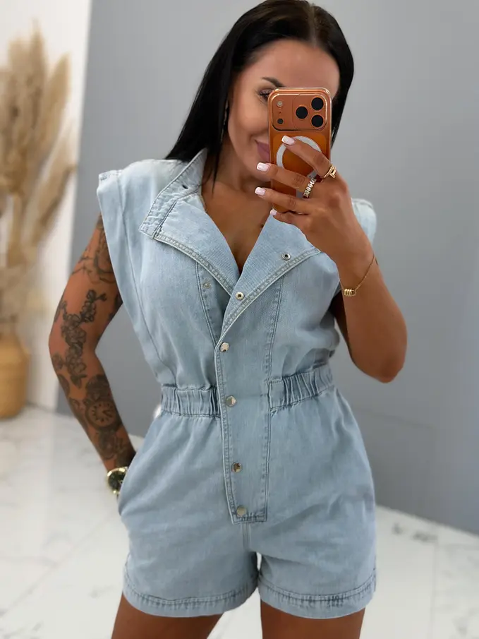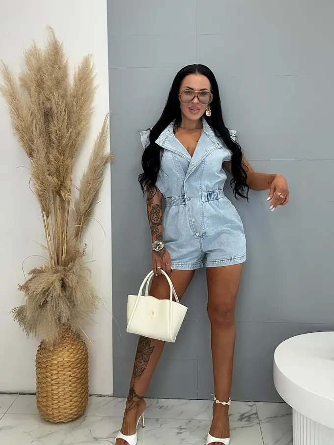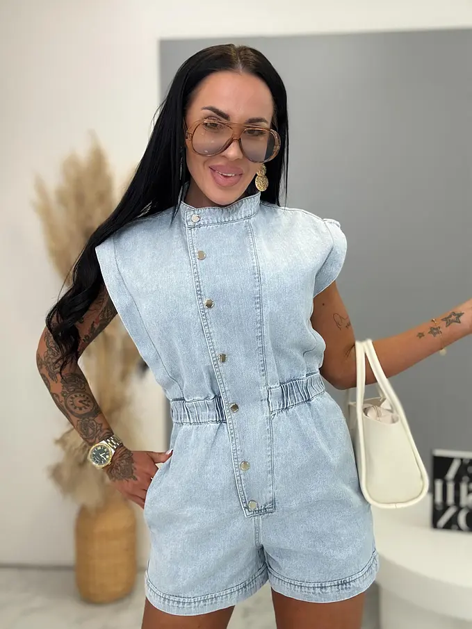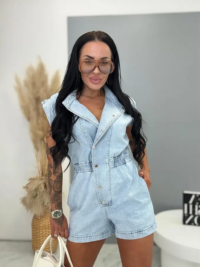 Overal s krátkymi rukávmi a golierom predstavuje moderný a zároveň praktický kúsok vhodný do každého šatníka. Zapínanie na strieborné cvoky zabezpečuje pohodlné obliekanie a dodáva modelu nenápadný dizajnový prvok. Bočné vrecká dajú väčší komfort pri nosení.