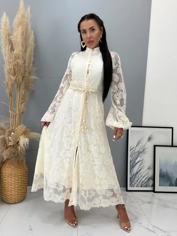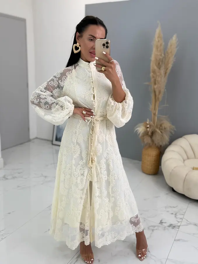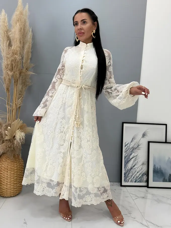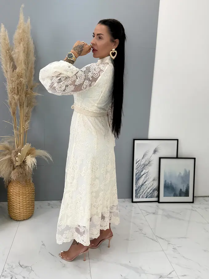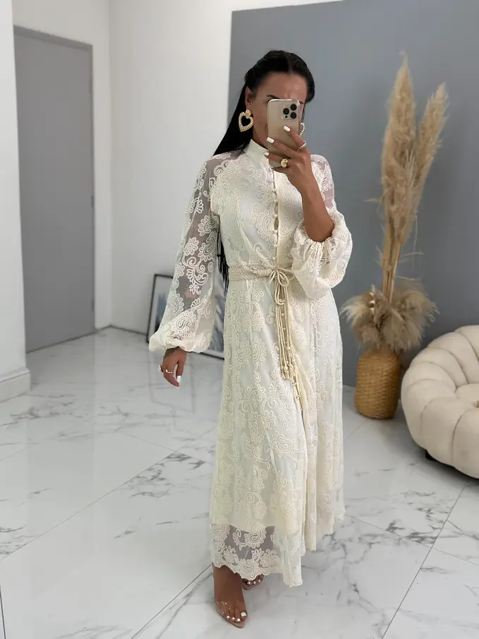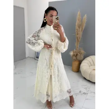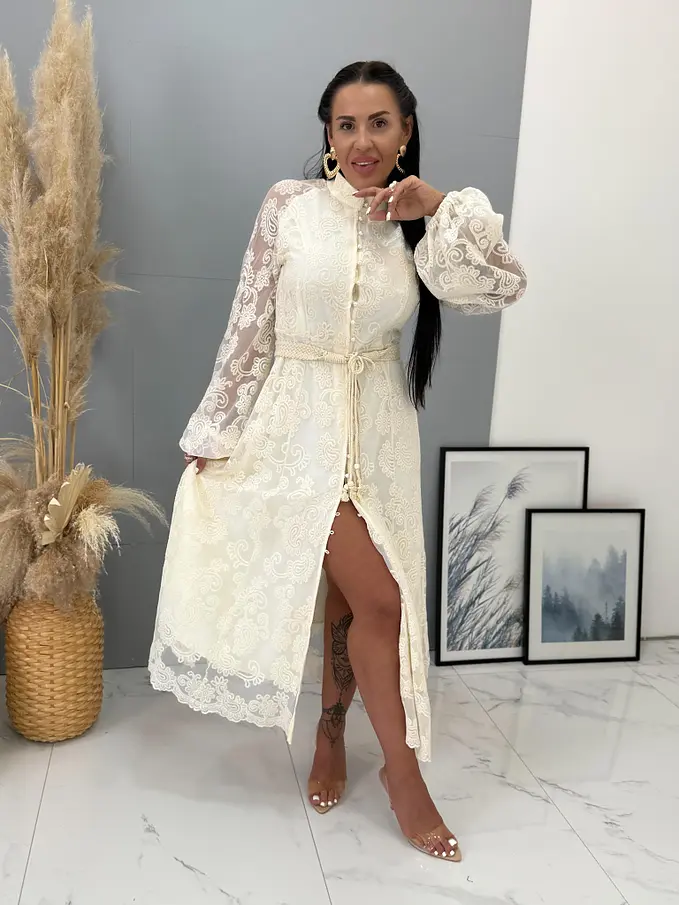 Krémové čipkované košeľové dlhé šaty s opaskom LAULINA