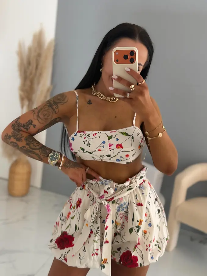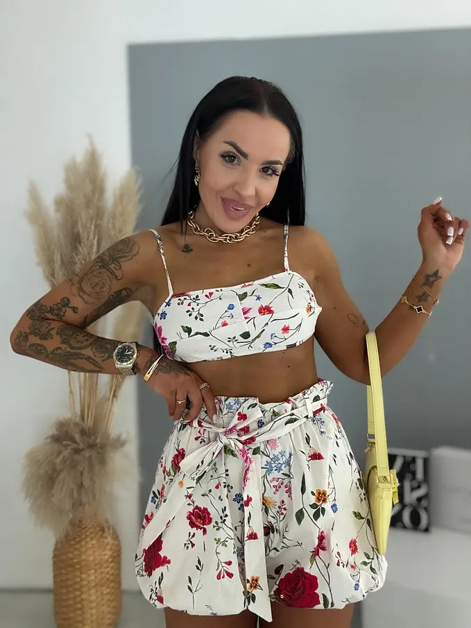 Kvetinový dvojdielny komplet z novej kolekcie priamo z Talianska. Pozostáva z crop topu a cibuľových šortiek. Materiál je príjemný, ale nie je elastický. Crop top sa viaže na zadnej strane. Ramienka sú nastaviteľné. Cibuľové šortky majú opasok a elastický pás so zapínaním na zips vpredu. Majú aj bočné vrecká.