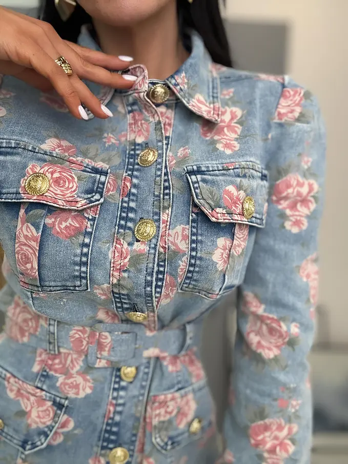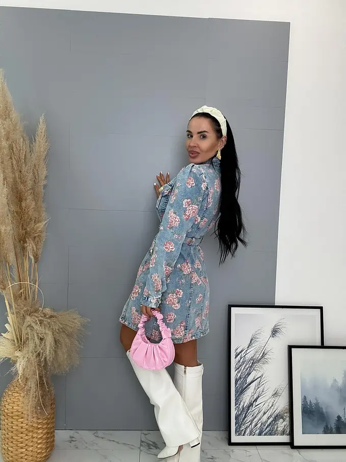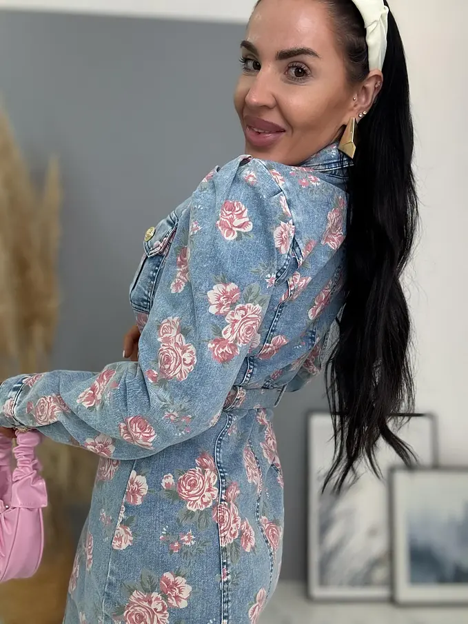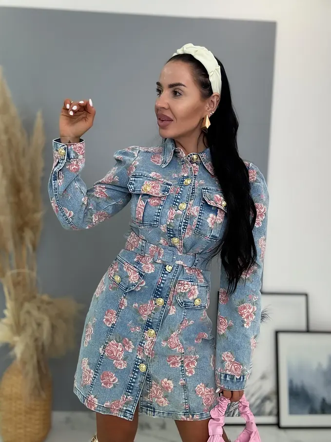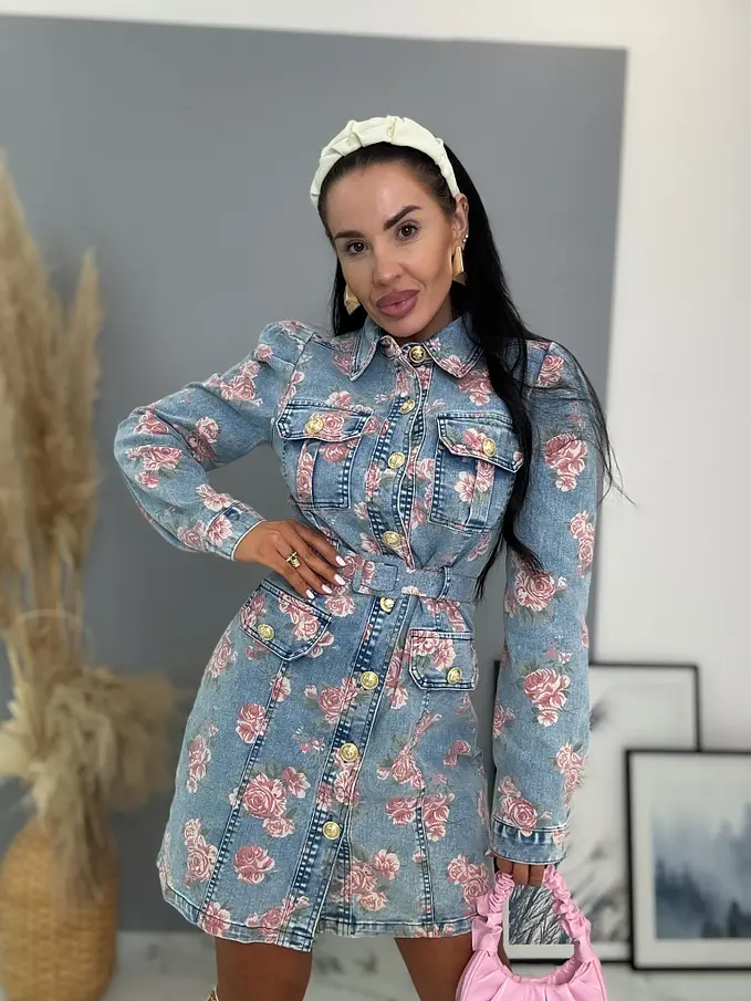 Kvetované denim šaty na gombíky s opaskom AMELY