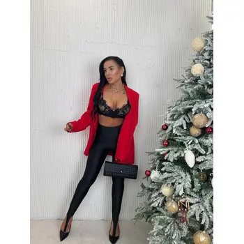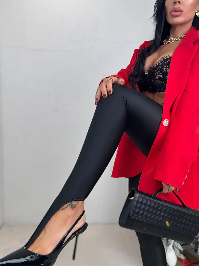 Trendy sťahovacie legíny s lesklým efektom. Skutočne musíš ich mať! Tento model s vysokým pásom má pútko na prst a elastický pás.