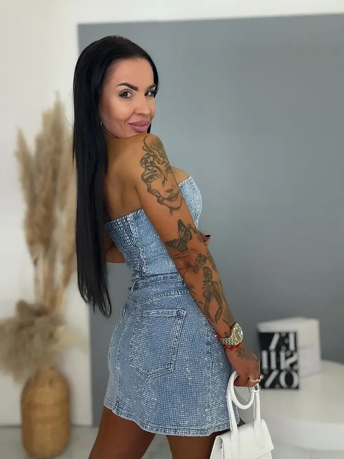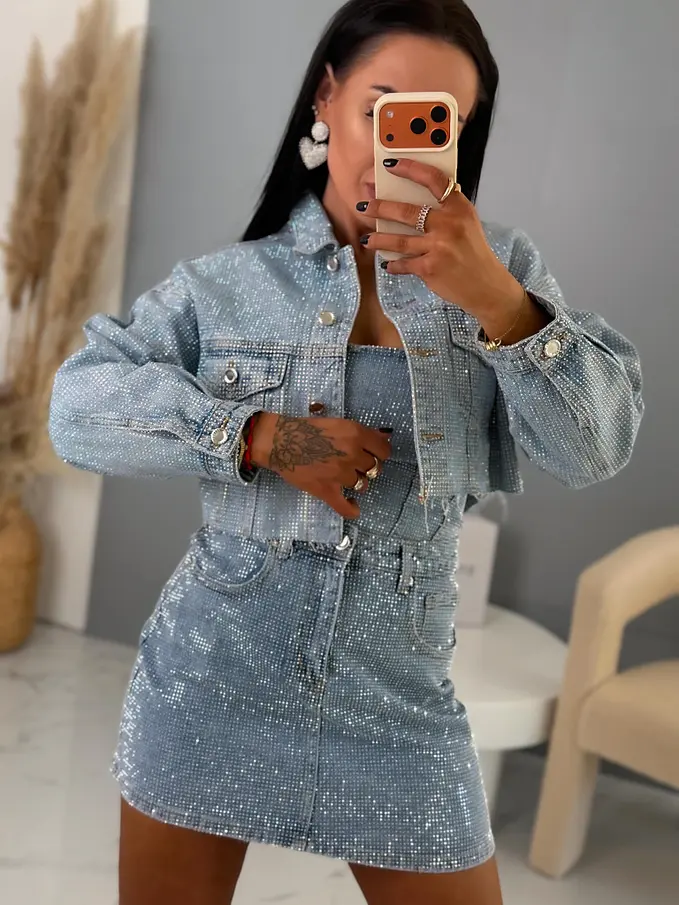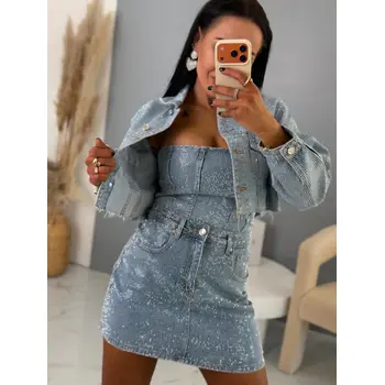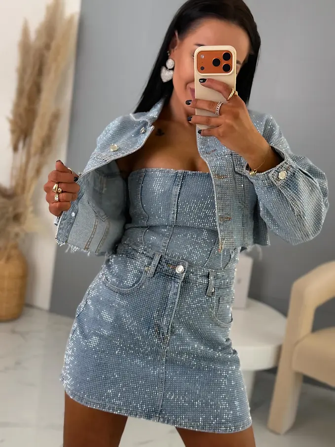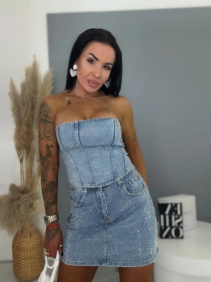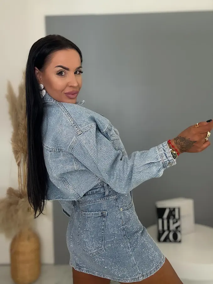 Skutočne módny kúsok, ktorý zaručene pritiahne pohľady. Modrá, neelastická látka zabezpečuje štruktúrovaný a moderný vzhľad, zatiaľ čo lesklé kamienky dodávajú extra žiaru.