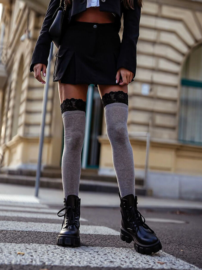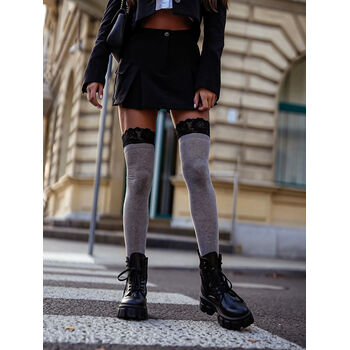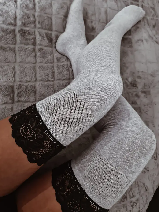 Dámske dlhé bavlnené ponožky nad kolená s krásnou čipkou okolo stehna. Vďaka svojej jedinečnej dĺžke tesne nad kolená z nich robí perfektnú voľbu na zdôraznenie akéhokoľvek štýlu.