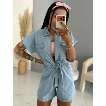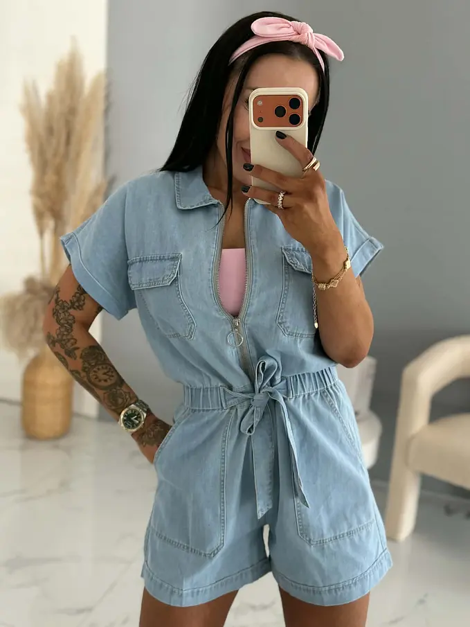 Tento overal so zipsom je ideálnou voľbou na teplé dni. Ľahký a vzdušný materiál zaručuje pohodlné nosenie, zatiaľ čo elegantný strih krásne zvýrazní postavu. Ozdobná viazačka v oblasti pásu jemne podčiarkuje ženské línie. Overal má praktické vrecká, vďaka čomu je nielen štýlový, ale aj pohodlný na každodenné nosenie.