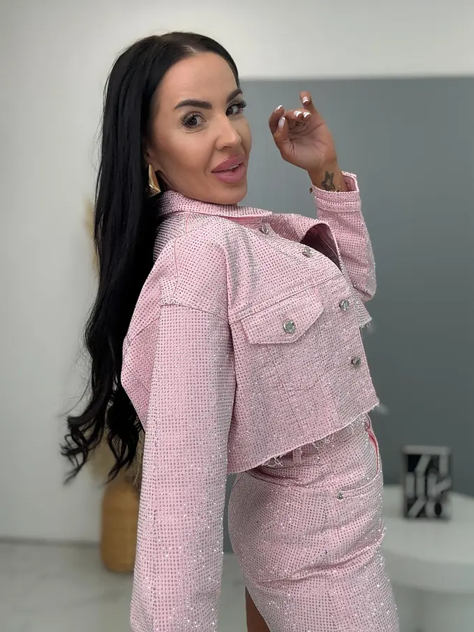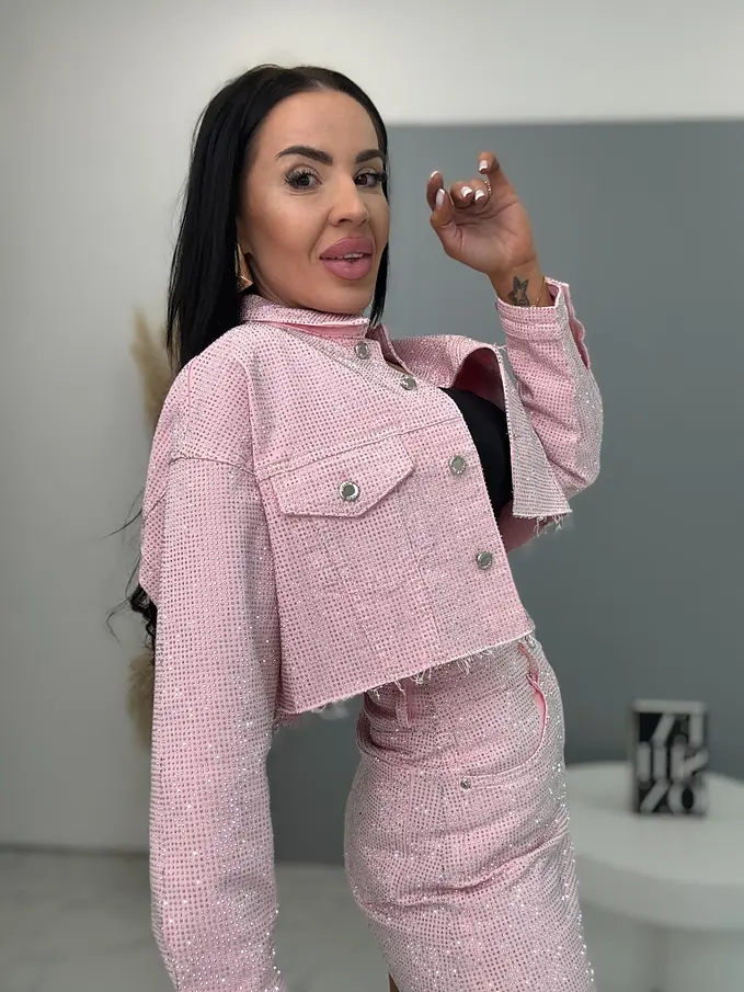Pink crop denim jacket s kamienkami CRYSTAL