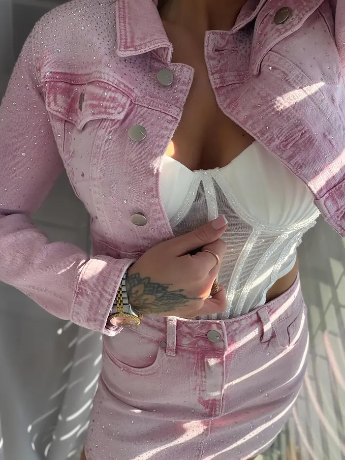 Dámsky pink jacket s ozdobnými kamienkami. Materiál je príjemný, a mierne elastický. Gombíky majú striebornú farbu.
