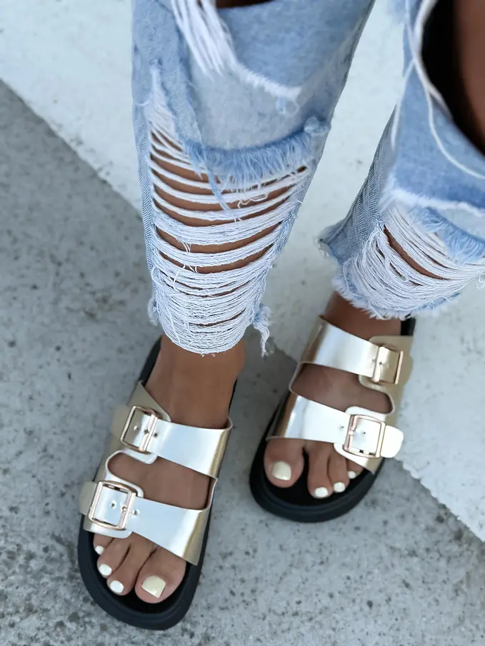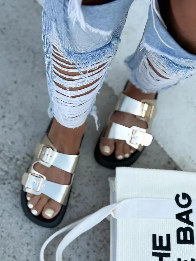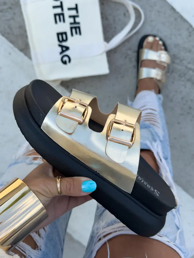 Dámske šľapky na každú príležitosť. Doplnky majú zlatú farbu.