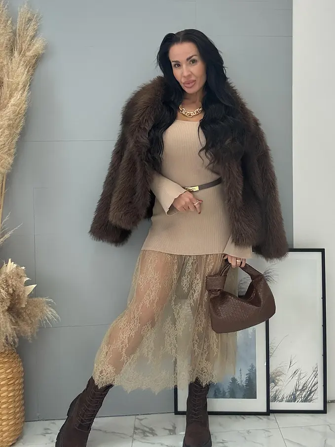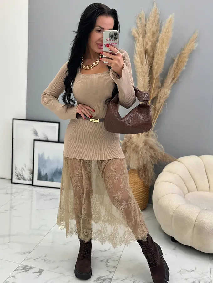 Pletené dlhé šaty z rebrovaného materiálu s čipkou DAYLIN