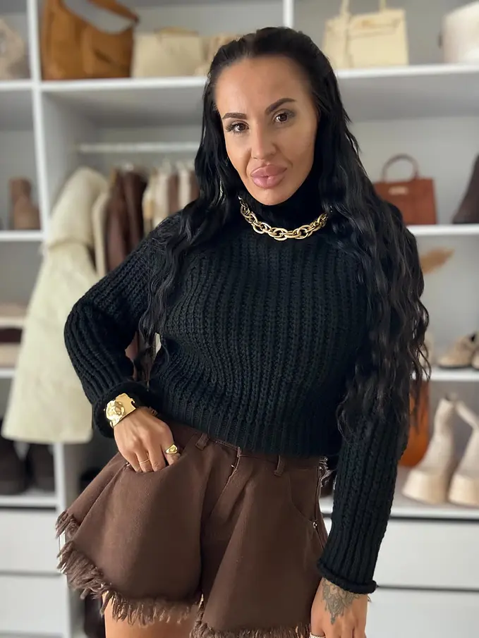 Modelka čiernovláska meria 164 cm a váži 64 kg. Nosí veľkosť M/L. Miery: 99 cm - 74 cm - 93 cm.