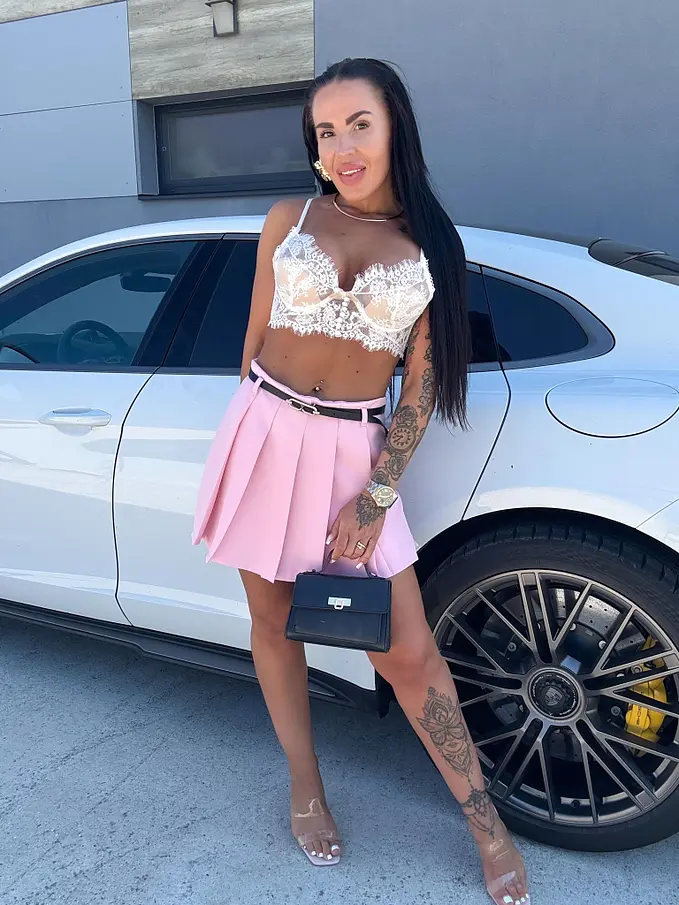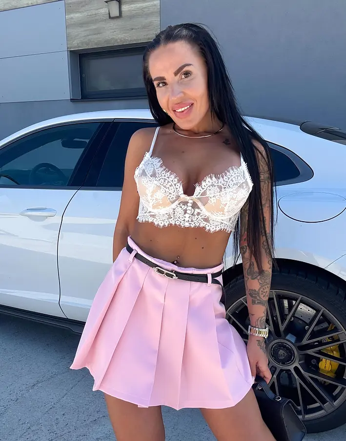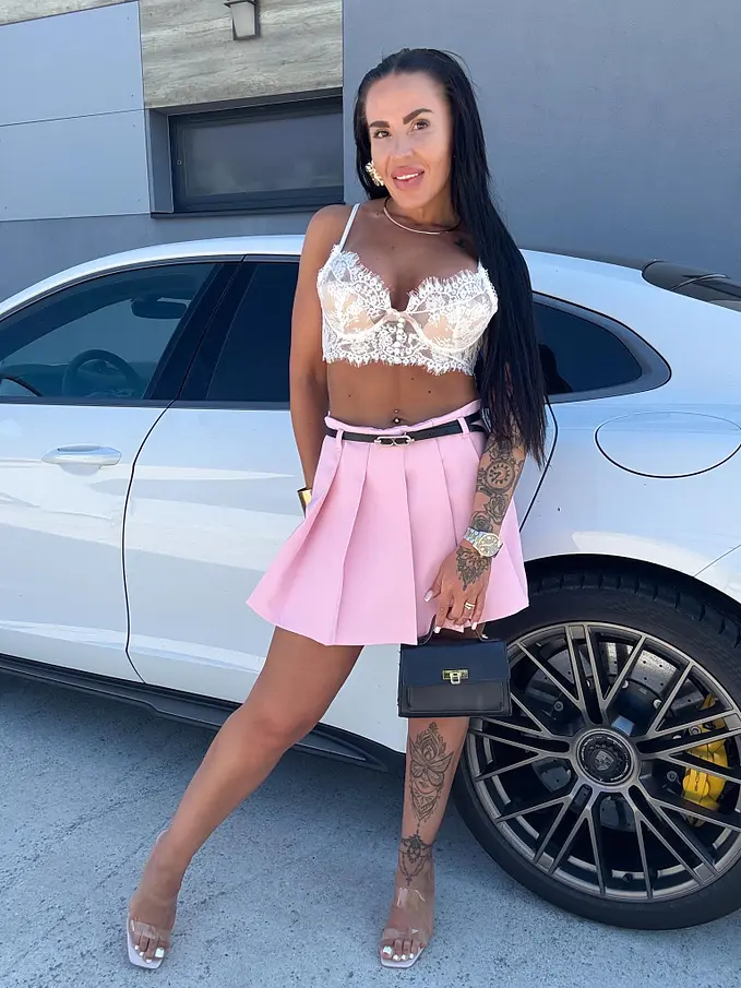 Modelka čiernovláska meria 164 cm a váži 57 kg. Nosí veľkosť S.
