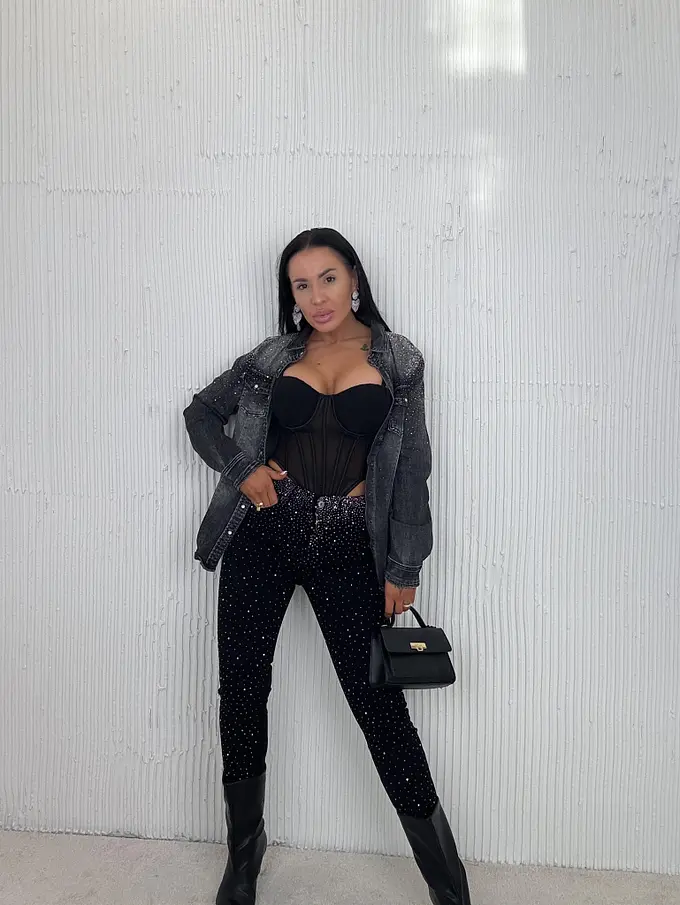 Modelka čiernovláska meria 164 cm a váži 57 kg. Nosí veľkosť S/M.