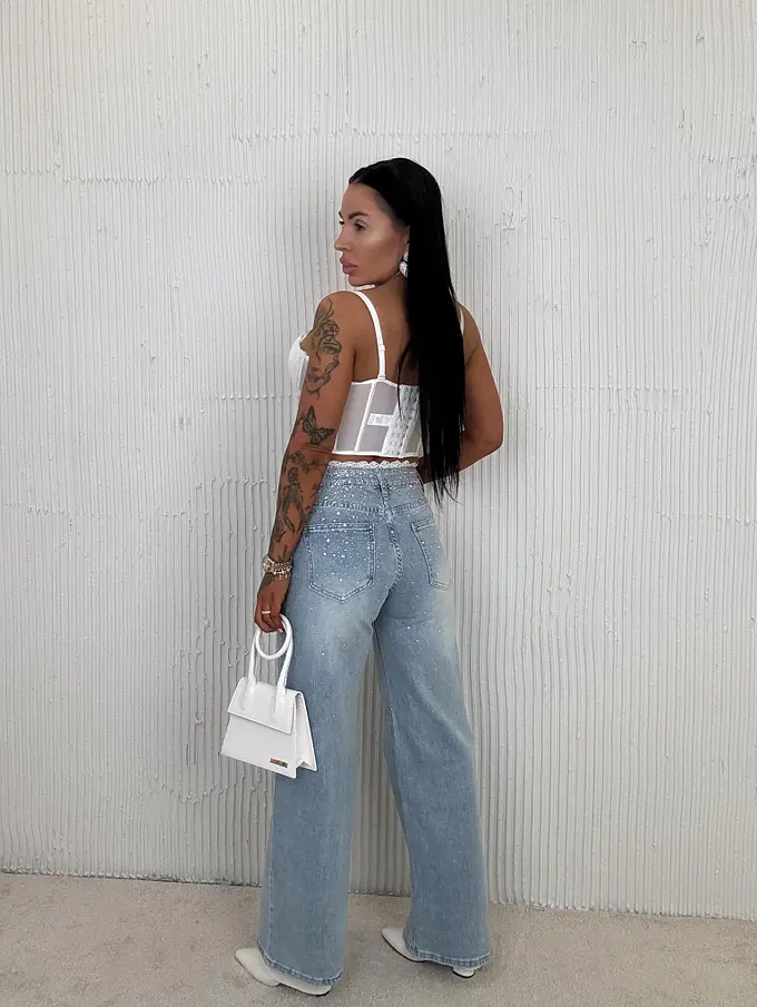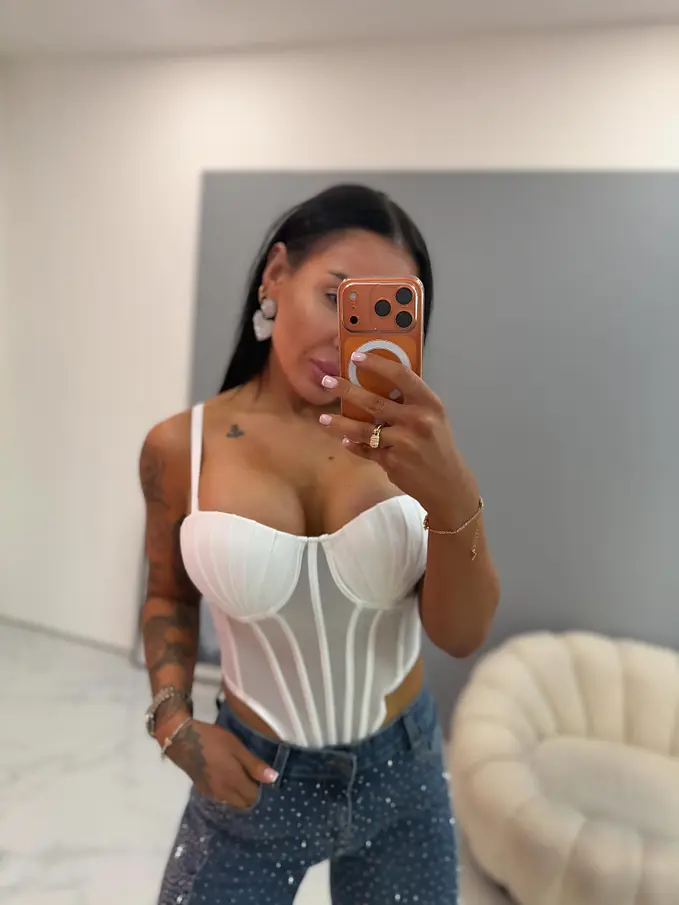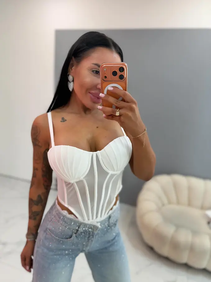 Modelka čiernovláska meria 164 cm a váži 57 kg. Nosí veľkosť S/M.